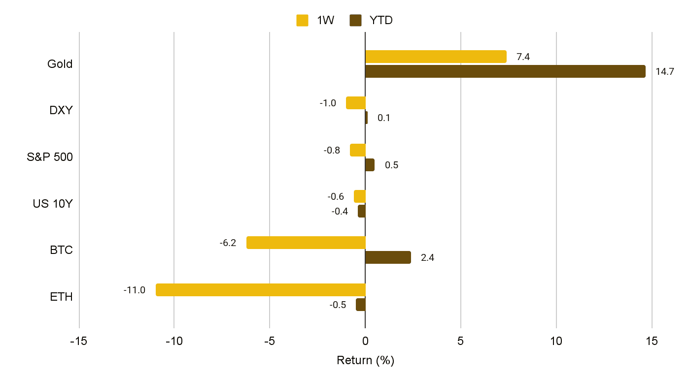 - 지정학적 이슈와 관세 충격으로 비트코인과 주식 전반의 연초 대비 상승분이 일시 반납되었으나, TACO 역학에 따른 정책 완화 조짐으로 부분 반등했습니다. 그러나 금이 위험 자산 대비 강세를 보이고 크립토가 주식보다 부진한 성과를 내는 등 반등세는 여전히 불균형합니다.