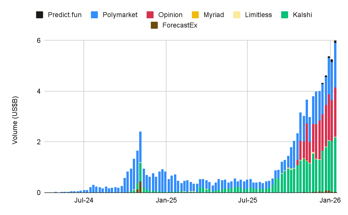 - 2025년 9배 이상 성장한 예측 시장은 이번 주 주간 명목 거래량이 처음으로 60억 달러를 돌파하며 새로운 이정표를 세웠습니다. 활동 범위 또한 단일 이벤트 시장을 넘어 지속적으로 확장되는 추세입니다.