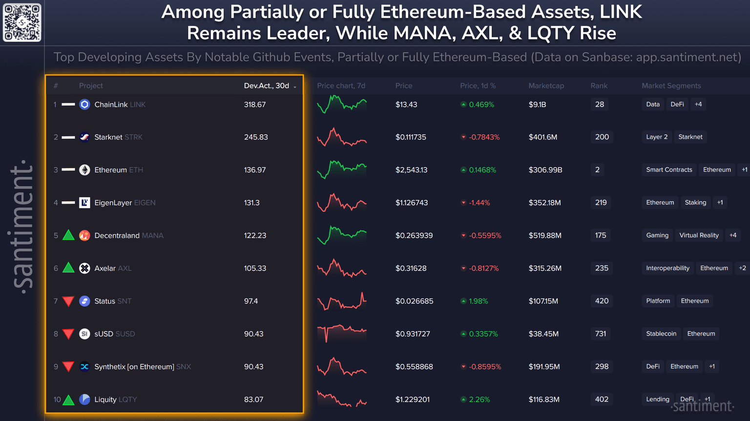 π§βπ» Here are crypto's top coins that are partially or fully associated with the Ethereum-based ecosystem, by development activity. Directional indicators repr