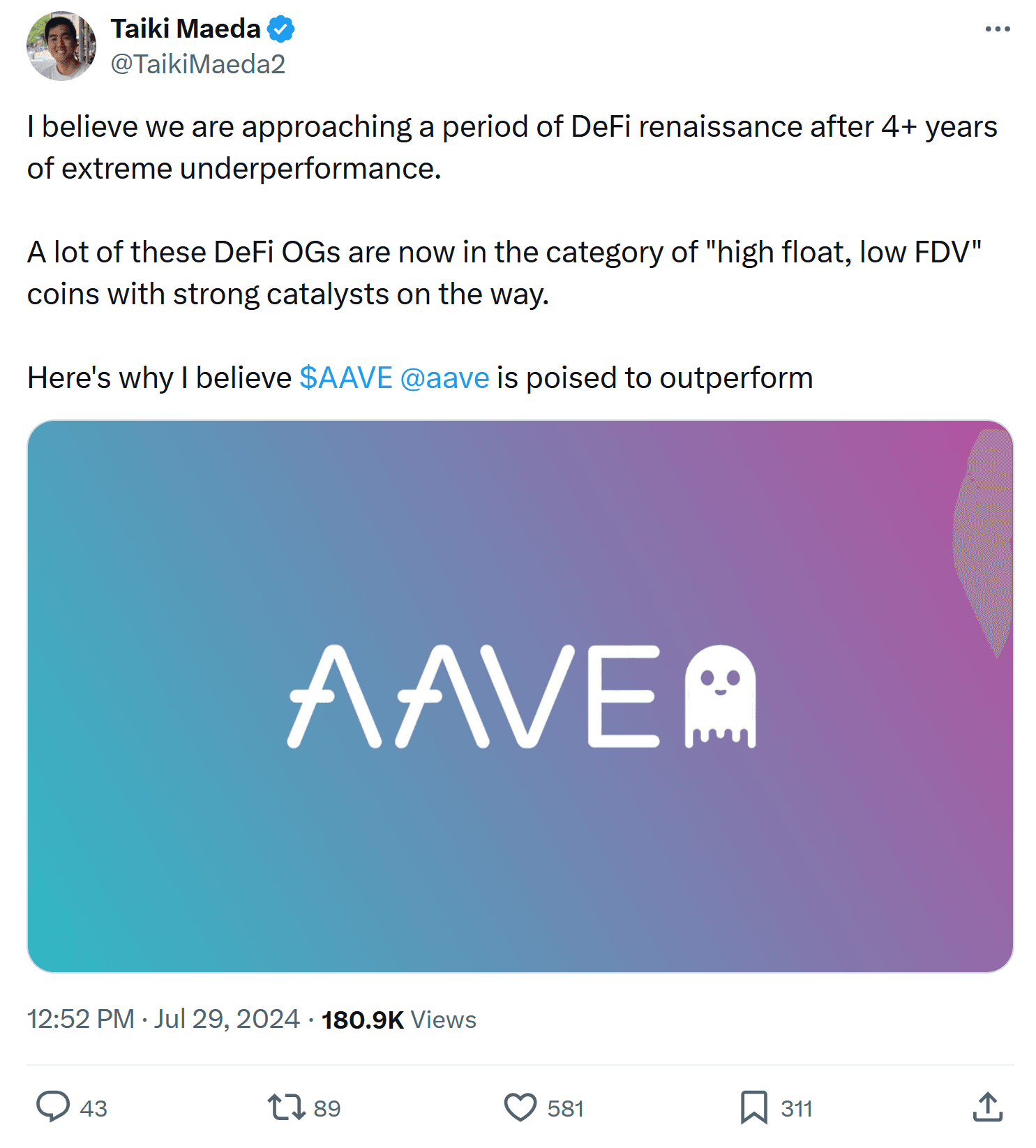 Aave has seen a remarkable market cap surge during the tumultuous middle of 2024 for all of cryptocurrency. The now 37th largest market cap has gained +7% in ju