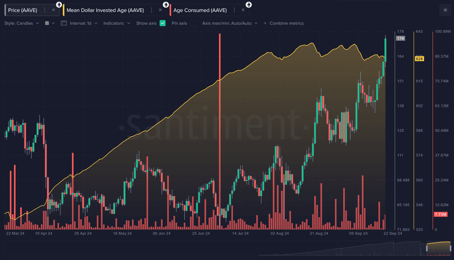 On top of these news stories that have propelled traders into using the platform at an increased rate, many of these positive changes to the platform has resulted in dormant coins beginning to be moved back into circulation. Often one of the most prominent signals on Santiment, AAVE has shown signs of being in a long-term bull market as a result of its 'Mean Dollar Invested Age' metric showing consistent drops (indicating stagnant coins are moving at a healthy rate) since late July.