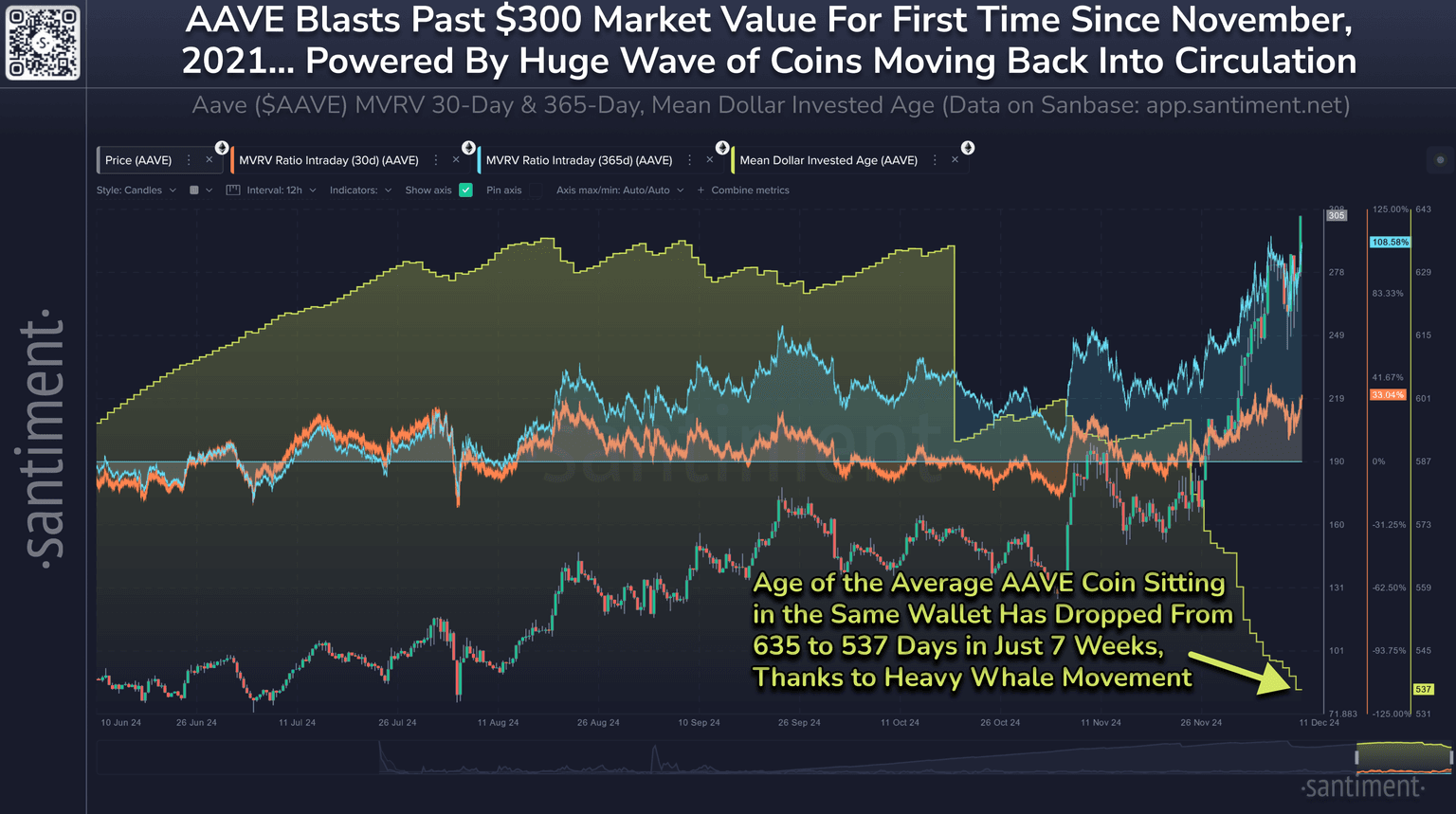 π As several altcoins grow today, AAVE has erupted to a market value of over $300 for the first time in over 3 years. Pay attention to projects that have massive drops in "Mean Dollar Invested Age" like AAVE. This indicates major key stakeholders are moving previously stagnant tokens back into circulation, perpetuating bullish momentum for the asset.