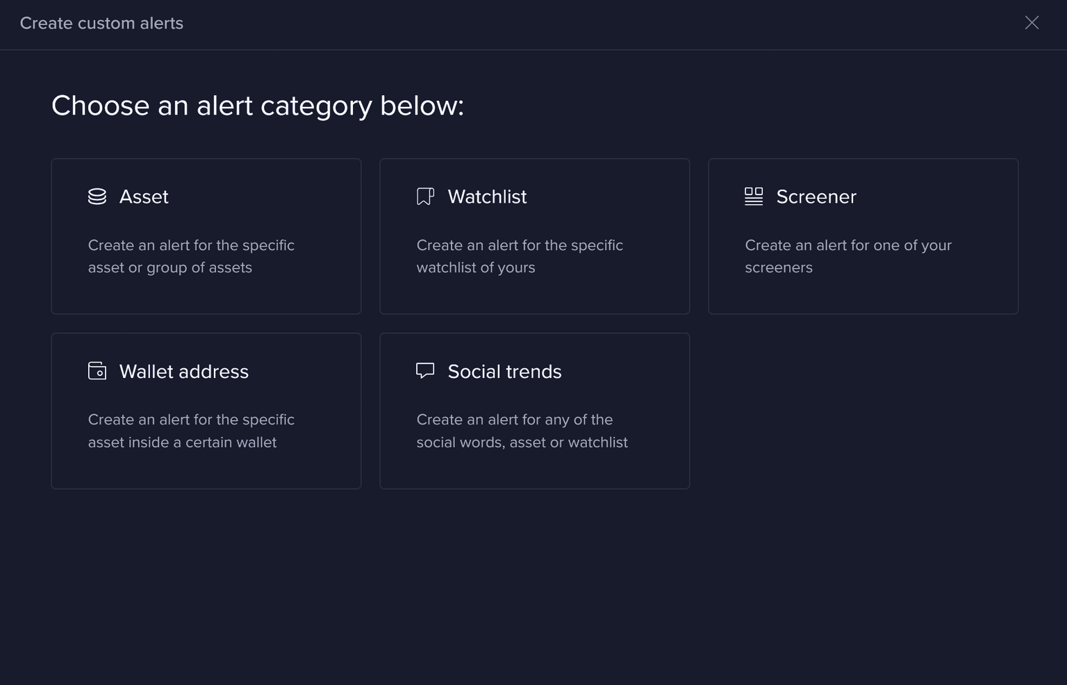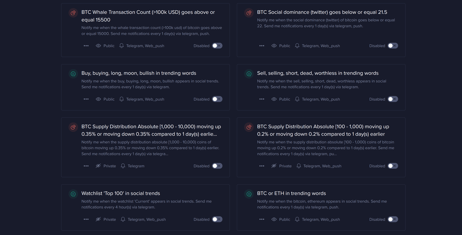 A few helpful examples would be: ποΈ Alert me when whale transactions for any top 100 asset triples in one day ποΈ Alert me when bullish commentary toward Bitco