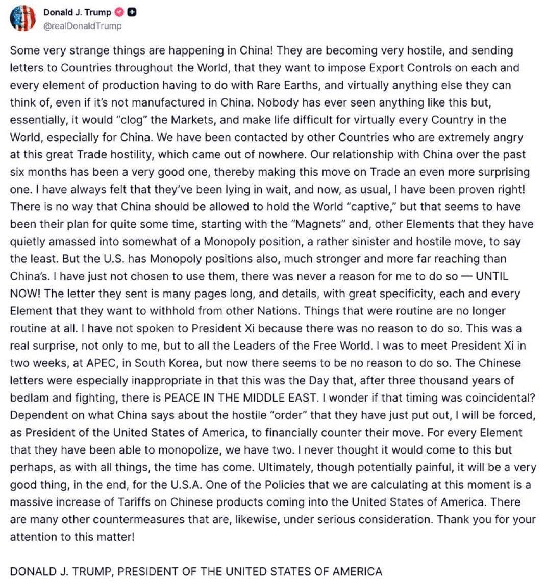 Who knew that the morning market (US time) shake-up Friday would be just the beginning? While stock markets were ranging, Trump used his Truth Social platform to deliver a sharp message about China and tariffs. His post accused Beijing of becoming βvery hostileβ and threatened a βmassive increaseβ in import duties on Chinese goods in retaliation for Chinaβs export controls on rare earth metals. The timing and tone of the message suggested an abrupt escalation in already tense trade relations. Many observers interpreted it as a rupture in what had been tentative progress in diplomacy between the two countries.