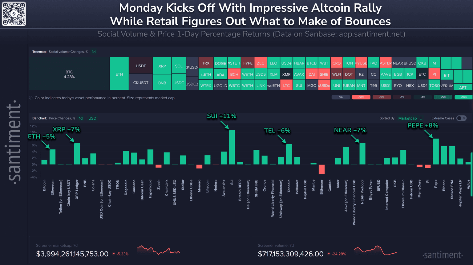 π Bitcoin has climbed back to a high of XRP (+7%) and others making up for last week's losses. Keep an eye on PEPE (+8%), TEL (+6%), & $ETH (+11%) as they look to continue their rebound after last week's FUD led so many traders to bow out of markets.