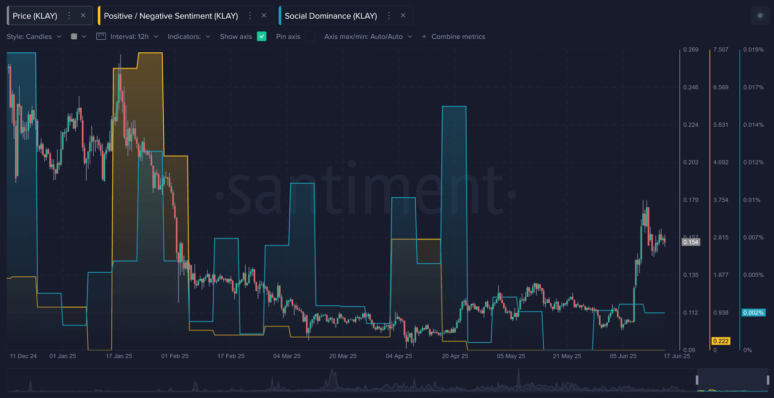 Klaytn is a public blockchain platform backed by Kakao, designed for dApps, especially in metaverse and gaming. It focuses on scalability and ease of adoption. It saw a nearly identical pump to KAIA in the 2nd week of June, and is +33% in the past 30 days. The asset is actually rarely talked about, making social data a bit too low of a sample size to truly be reliable. But for what it's worth, only 0.002% of all crypto discussions are related to the 96th market cap in crypto.