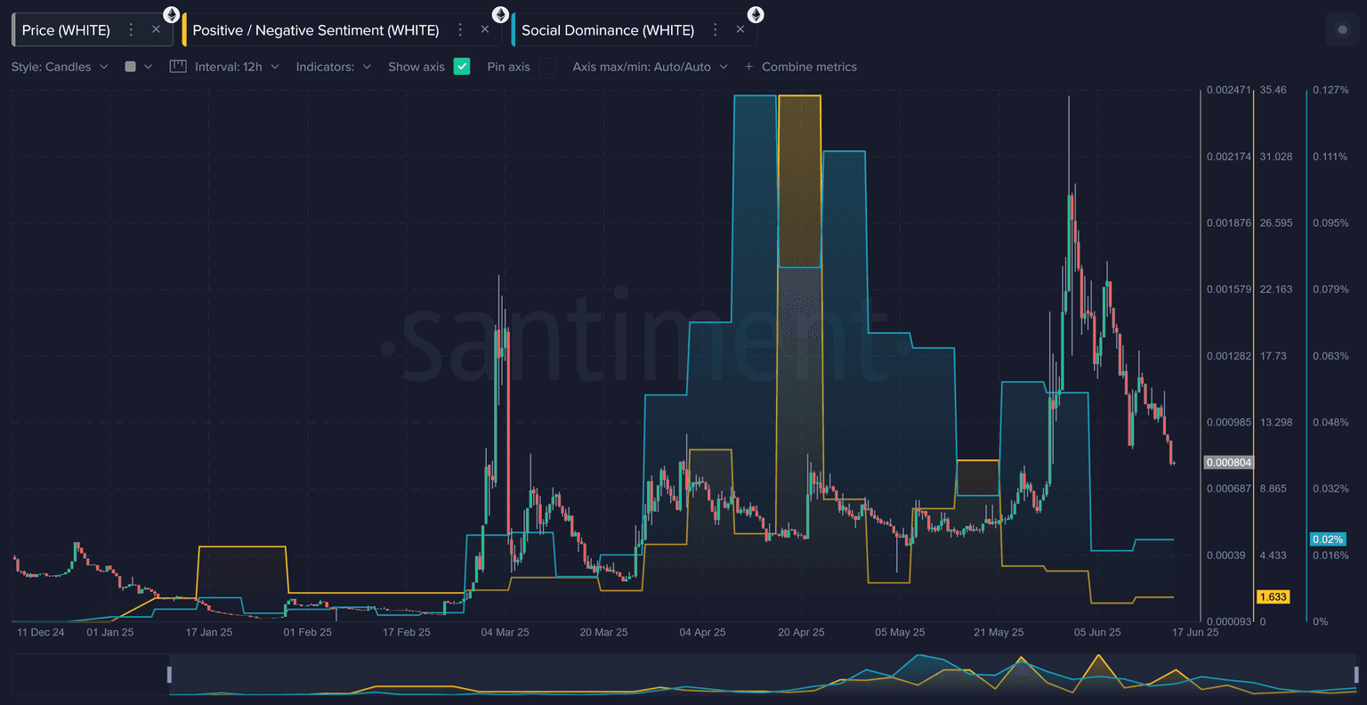 WhiteRock is a realβworld asset (RWA) protocol that tokenizes stocks, bonds, options, and property. It bridges traditional finance and crypto via tokenized securities. Even though the coin's market value is +66% in the past 30 days, it has actually dropped nearly -60% since its peak two weeks ago. This has led it to being right back off of traders' radars, and could be a sneaky play. Especially with social dominance back to its pre-pump March levels and only 1.6 bullish comments per bearish comment.