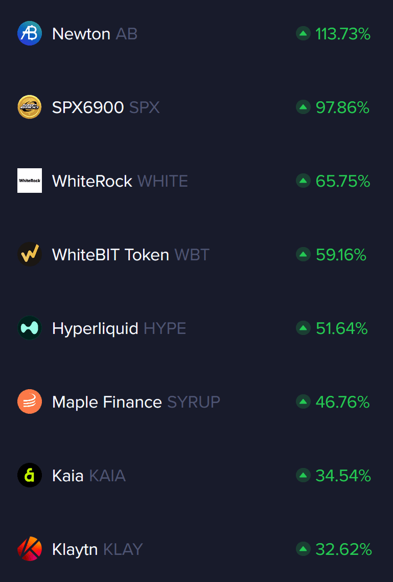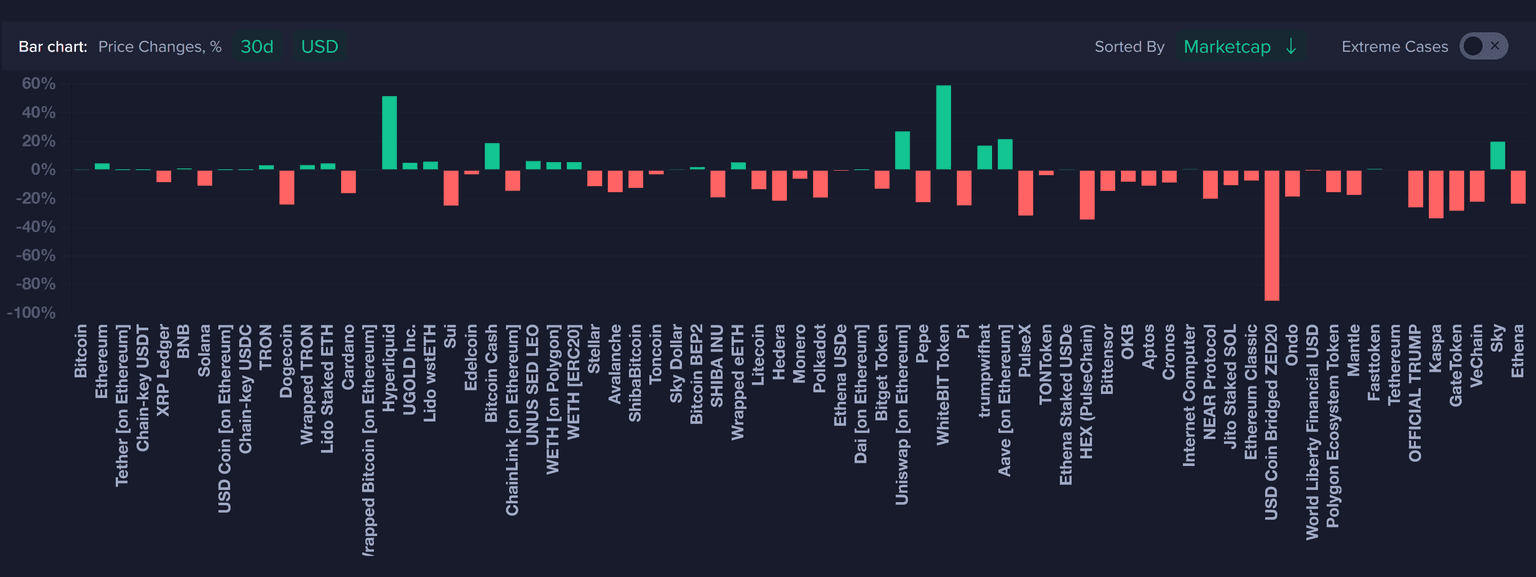 Whether the gains for each project continues depends heavily on crowd behavior. Markets move the opposite direction of the crowd's expectations, and it has been this way since the existence of the speculative-driven crypto sector began. Therefore, if retail traders start piling into these pumping assets out of greed or fear of missing out (FOMO), prices could peak and reverse quickly. However, if the crowd is more skeptical and chooses to take profits or ignore the hype, this may actually be a bullish sign that the rally has more room to grow. Understanding the emotional state of the market is key, especially during times of uncertainty. In the sections that follow, weβll break down the strongest-performing large and top cap coins this month, including their recent 30-day performance data.
