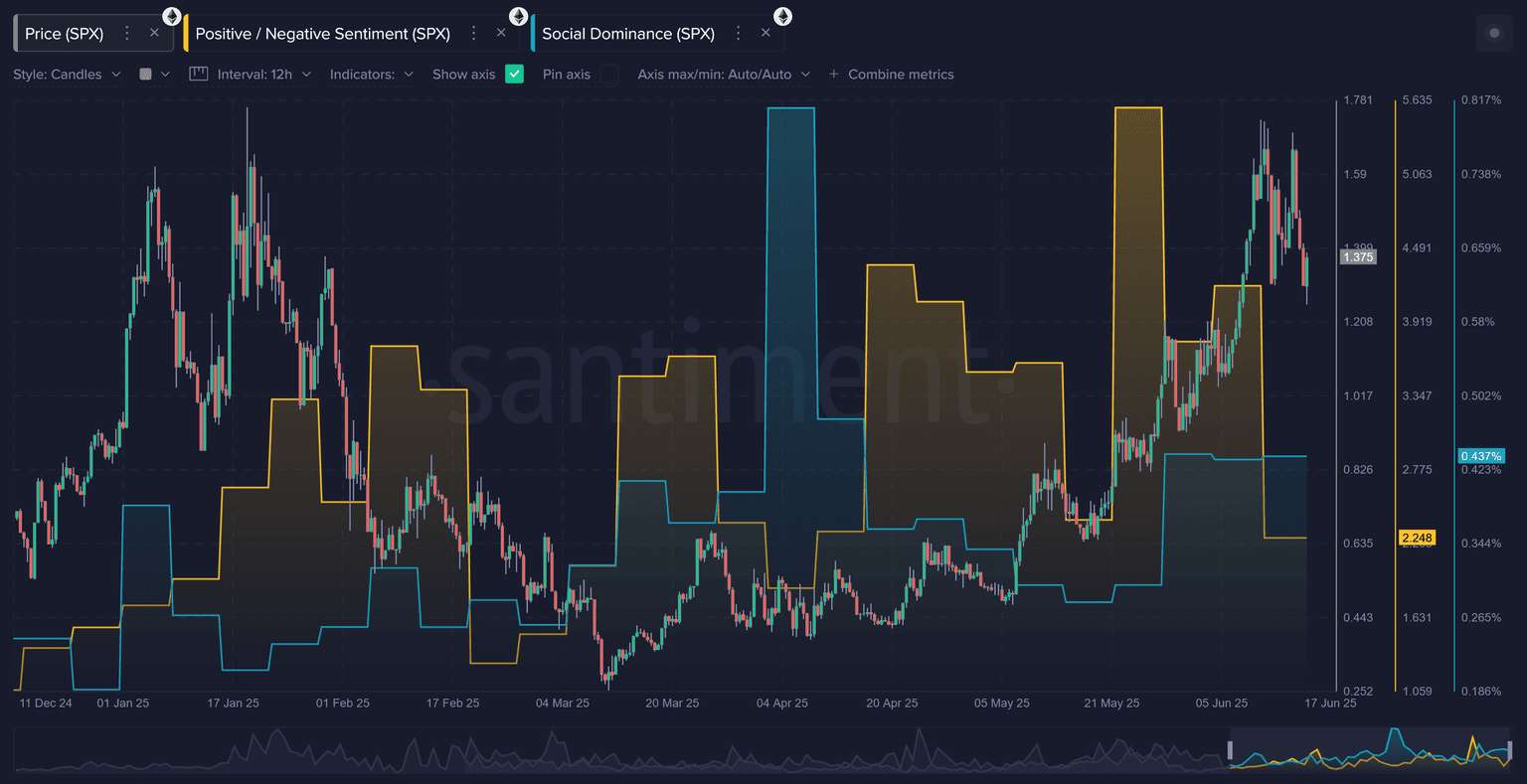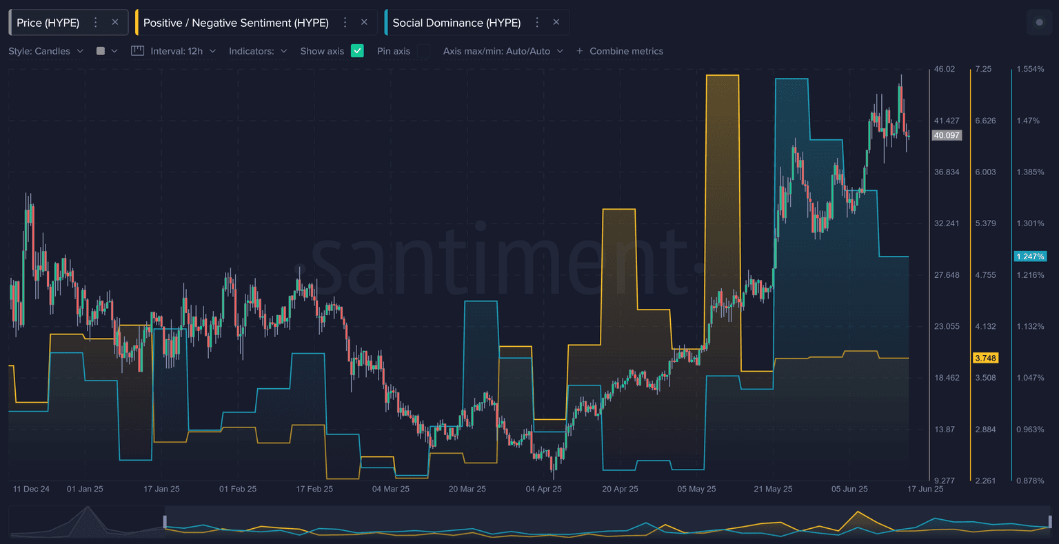 HYPE is the governance and utility token of Hyperliquid, a decentralized perpetuals exchange. It has been among the darlings of altcoin traders in 2025, and for good reason. The coin's market value has approximately 4x'd since its bottom back on April 7th, and it's up another +52% in the past 30 days. The social dominance this week still sits at 1.25% of all crypto discussions after being above 1.5% in late May. On top of that, the bullish comments outnumber the bearish comments 3.75 to 1. Not ideal for a continued pump, so you may want to consider allowing HYPE's social dominance to at least fizzle down a little bit.