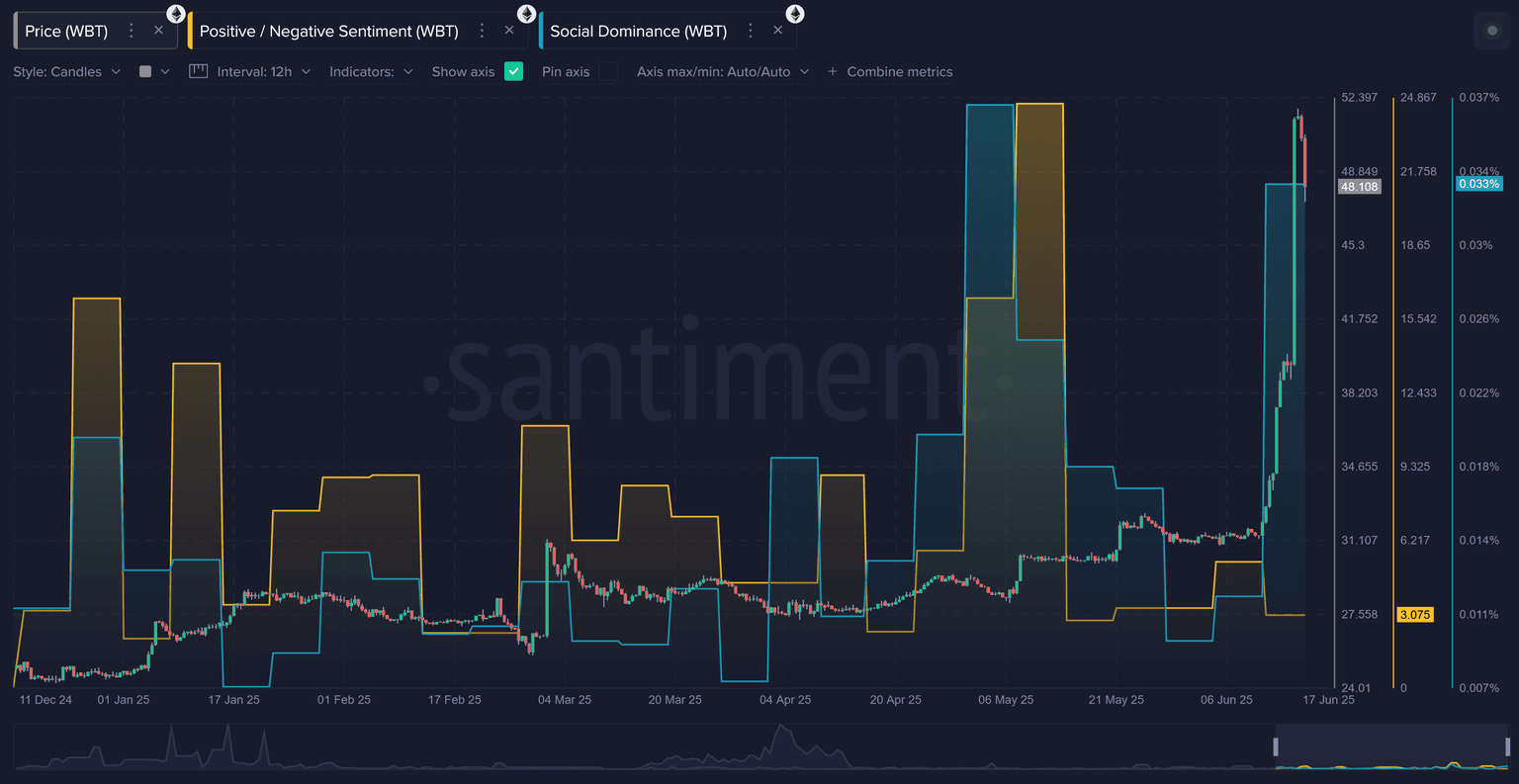 WBT is the native token of WhiteBIT, a large European crypto exchange. It benefits from trading volume, fee discounts, and IEO participation. The 12th largest market cap in crypto has been on a massive +61% run in just the past week alone, making its pump among the most recent on this article's list. Social dominance has predictably erupted for WBT, but the positive sentiment isn't showing any notable excitement from the crowd whatsoever. We likely will see its price make a second run after its local top that just occurred on June 15th unless FOMO begins to make an appearance.