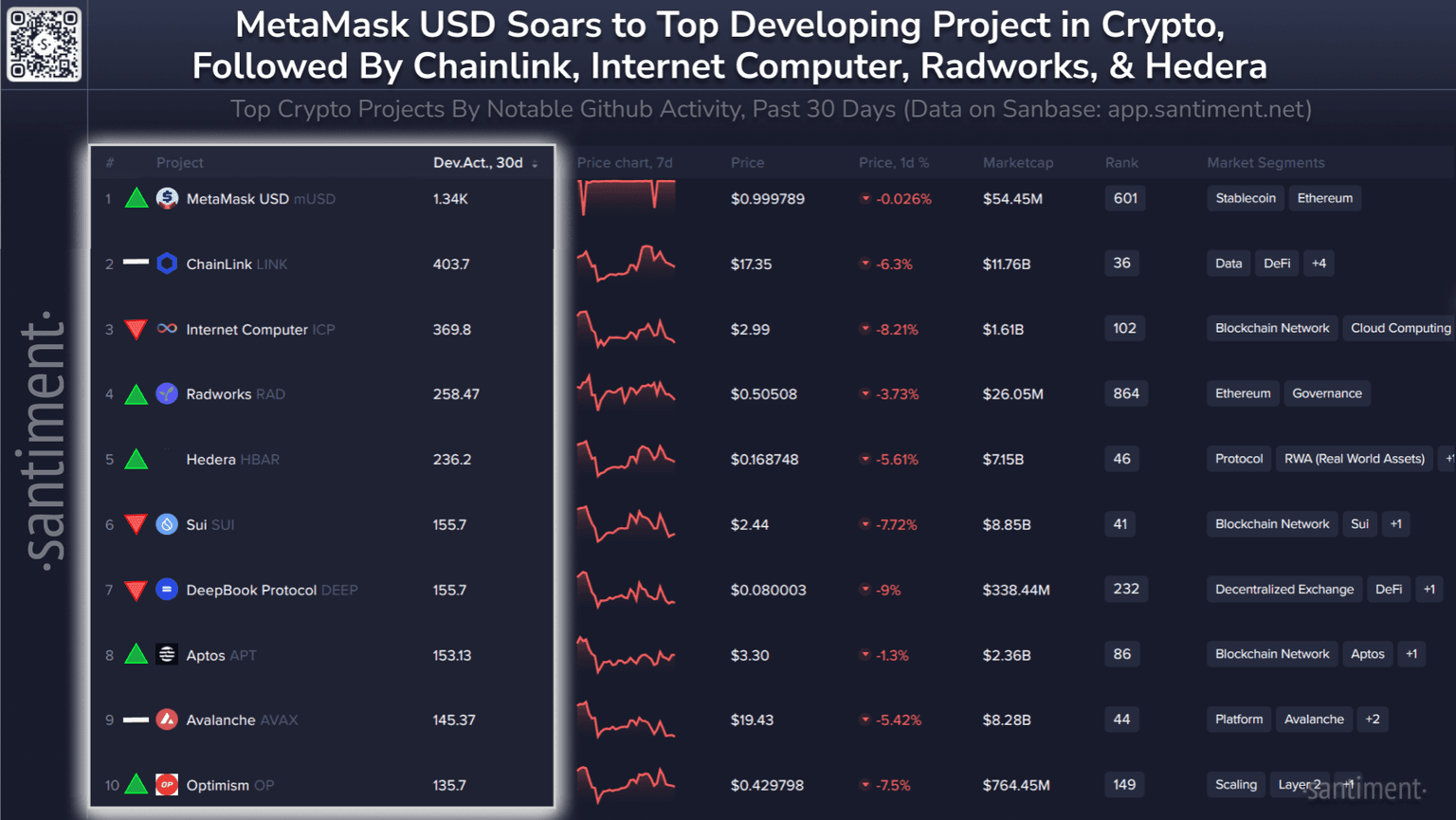 π§βπ» Here are crypto's top overall coins by notable development activity the past 30 days. Directional indicators represent each project's rank rise or fall si