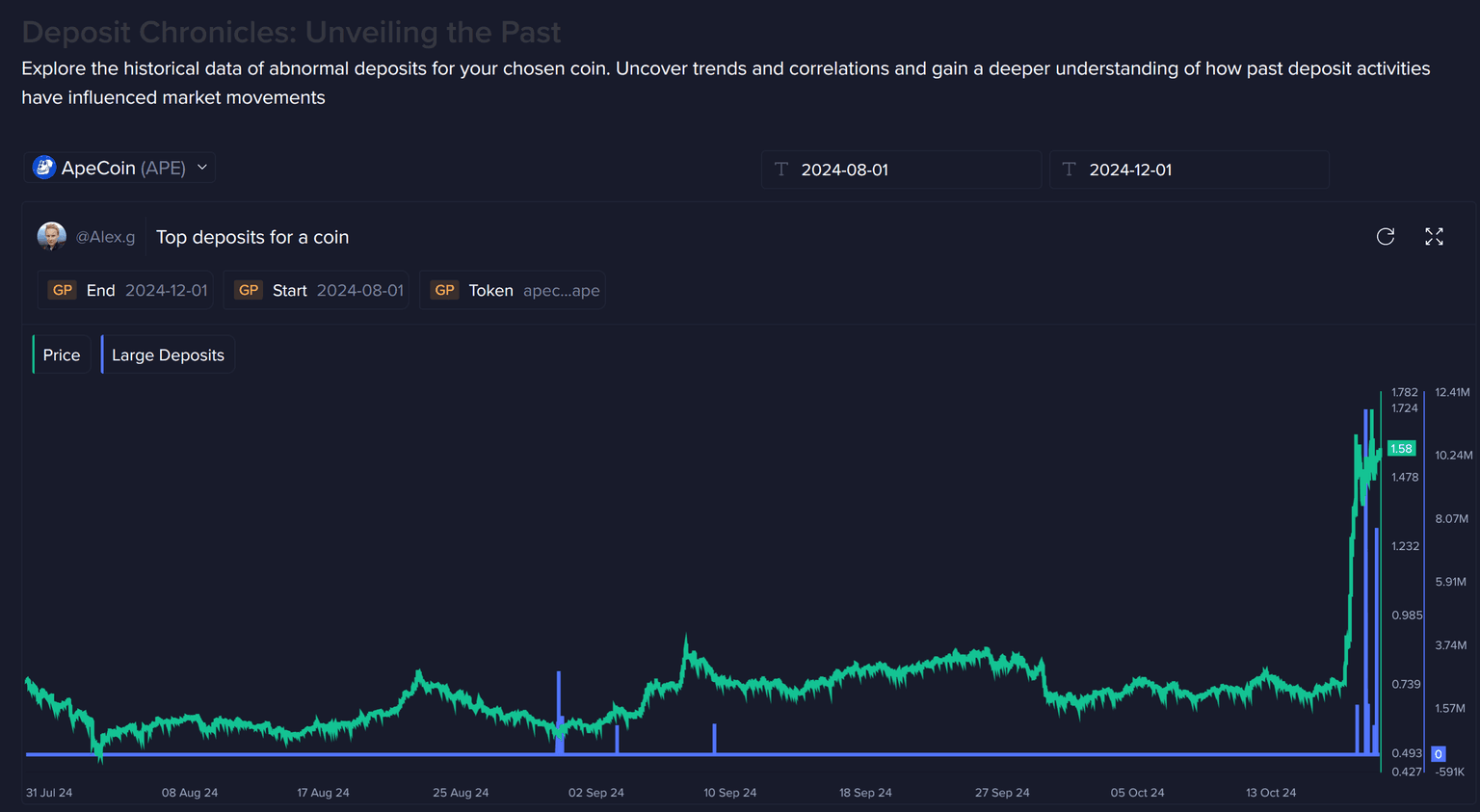 Further, we see on the dashboard (directly below the list of coins) when sorting by ApeCoin large deposits ($1M or more), that the amount of deposits soared after the pump. More clear top signaling.