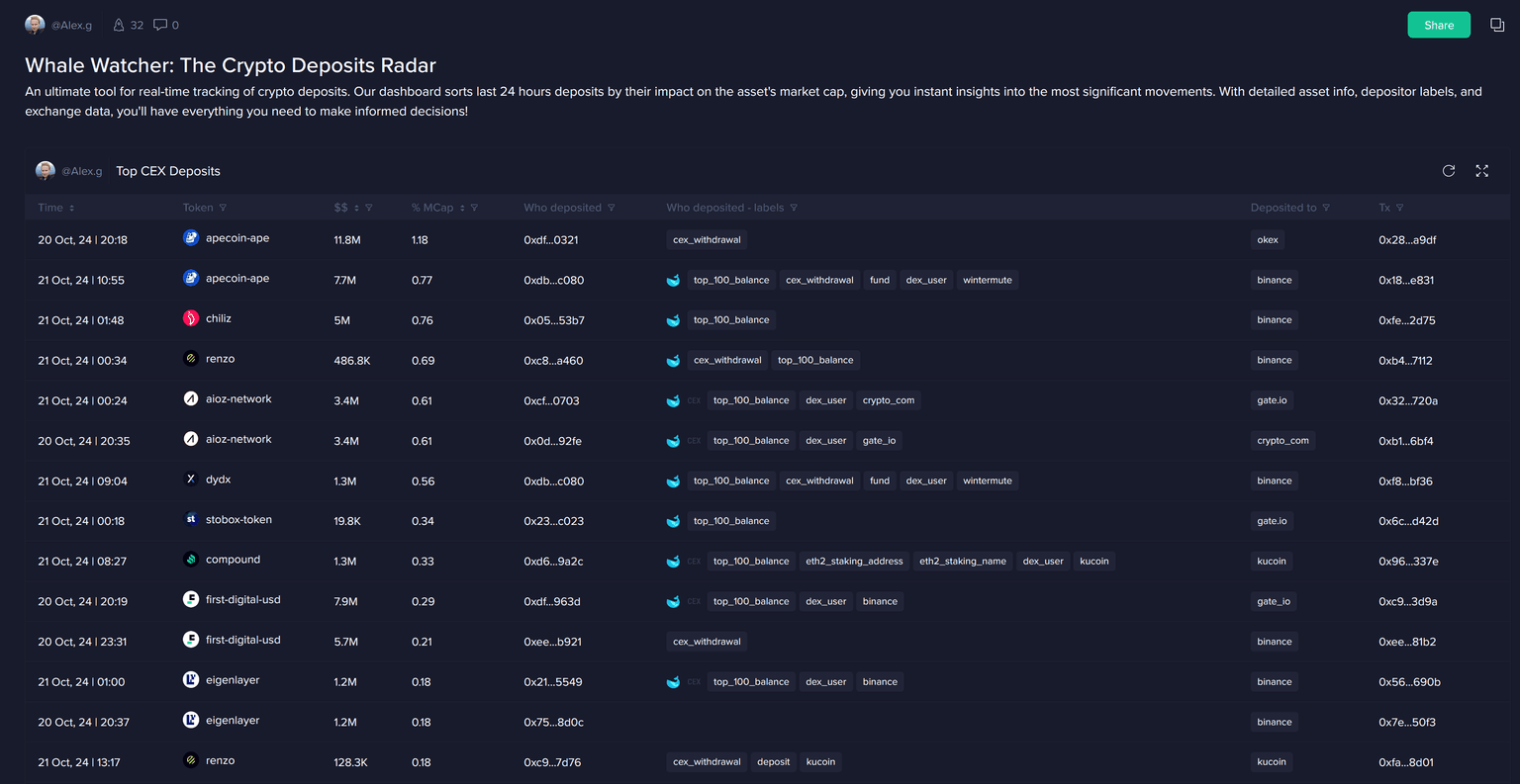 Below is a snapshot of the last 24 hours, as of the time of this writing. We can see that Apecoin, among the top performing coins over the past 48 hours (+110%), has had the two largest deposits on to centralized exchanges. This included: