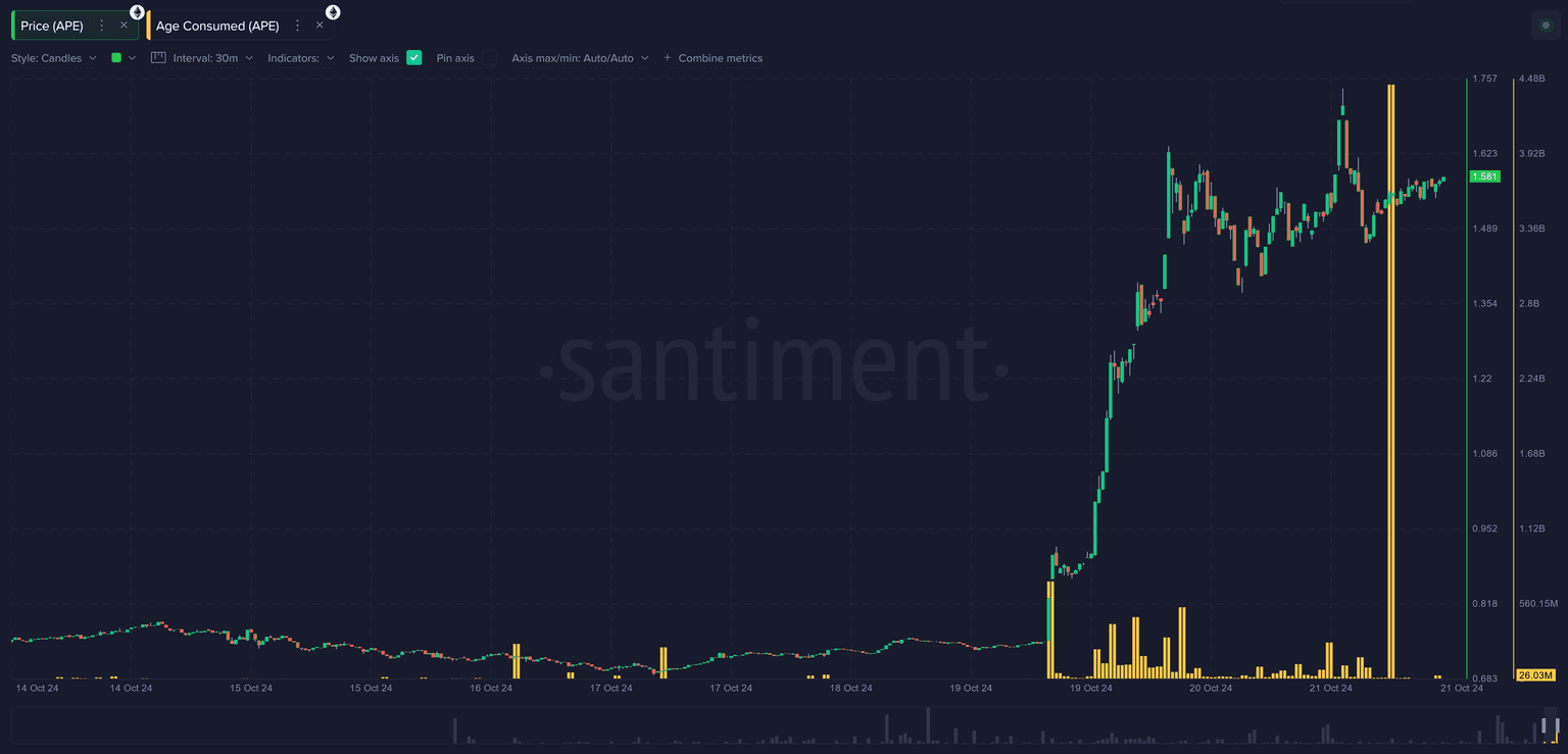 Apecoin's ascension was also followed by a massive Age Consumed spike (a sign of dormant coins moving) that aligns with the same hour of the aforementioned $7.7M Binance deposit.