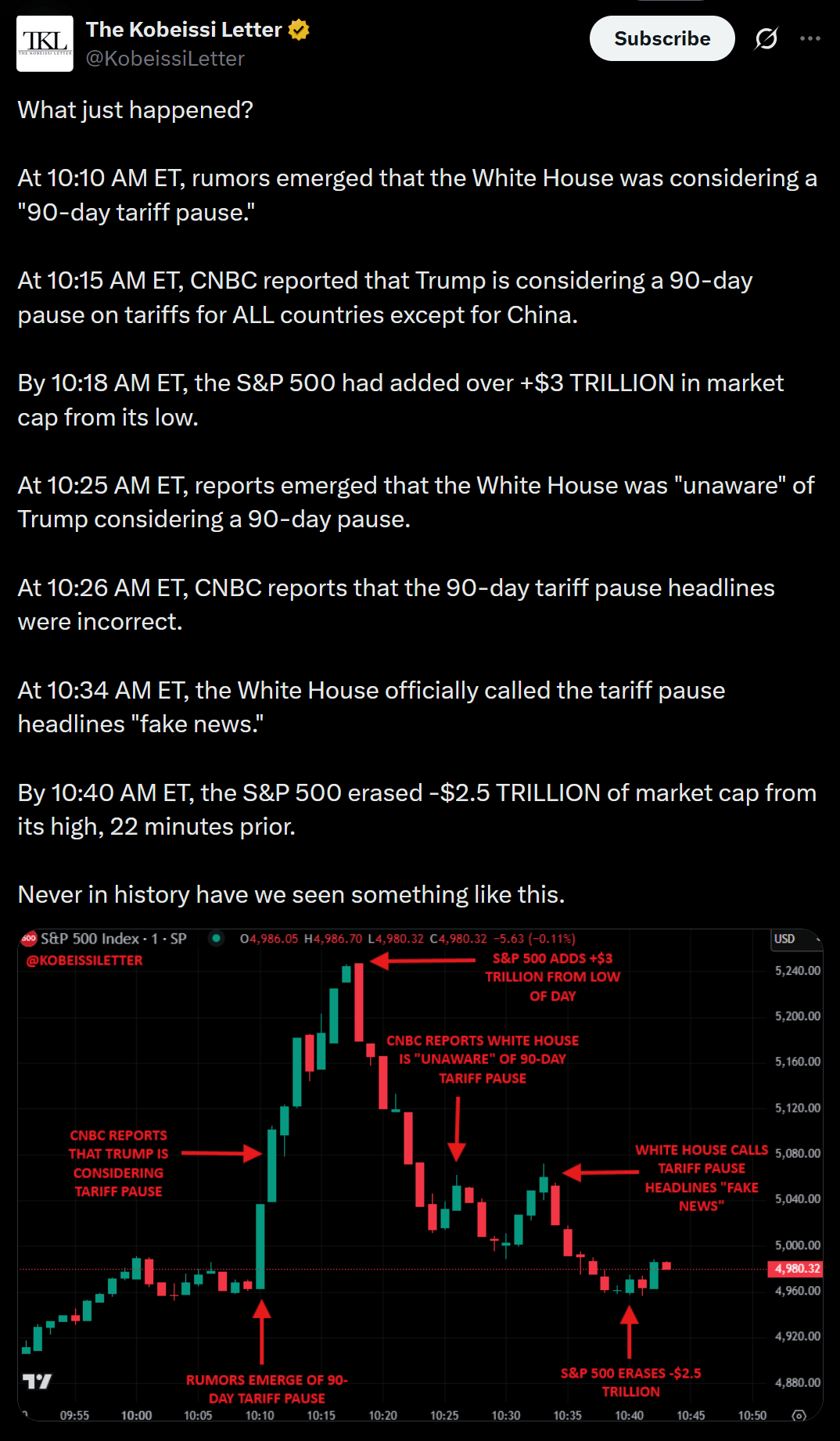 The day started with tension already in the air after last week's rough trading week, caused by tariff announcements. Around 10:10 AM ET, several popular accounts on X (formerly Twitter) began posting that President Trump might pause tariffs for 90 days—except for China. The rumor didn't link to any official source but caught fire anyway. Many believed the story was based on a morning TV interview with Kevin Hassett, a senior economic advisor to Trump, who had made vague comments about the President "considering options" on Fox News.
