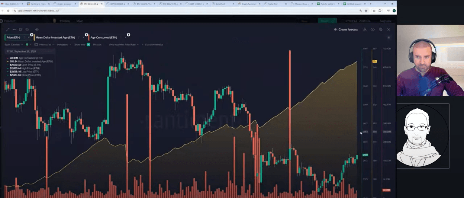 Maksim provided insights into whale behavior and stablecoin movements. He emphasized the importance of looking at divergences in trading volume, daily active addresses, and social volumes to spot market tops. Maksim noted that while the current market activity is high, it is crucial to watch for signs of profit-taking and redistribution among large holders (whales). He pointed out that the mean dollar invested age for Bitcoin has flattened, indicating that stagnant coins are moving back into circulation, which is a positive sign.