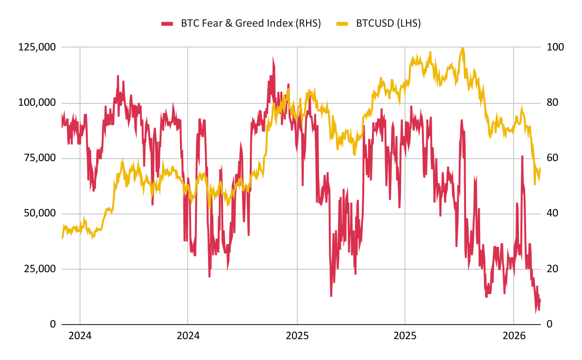 - 심리가 급격히 악화되었음에도 시장은 미화 65,000~70,000달러 범위를 유지했습니다. BTC 공포 탐욕 지수는 5를 기록하며 역사적 저점 부근에 머물고 있는데, 이는 과거 주요 충격 사태 때보다 낮은 수치로 개인 투자자들의 투매를 반영합니다.
