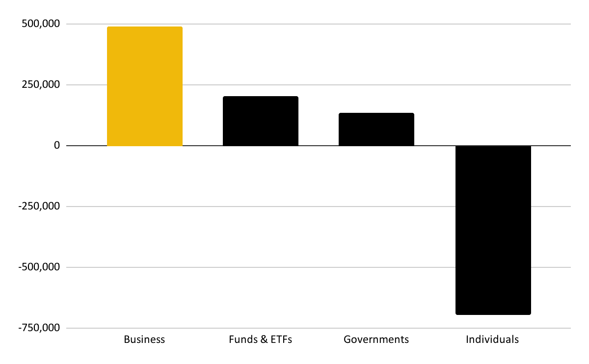 - 소유권 역학 관계도 이러한 변화를 뒷받침합니다. 지난 1년 동안 BTC 공급량은 개인에서 기업, 펀드, ETF로 이동합니다. 개인 투자자들은 순매도를 보이는 반면, 기관 그룹은 축적을 지속하고 있습니다.
