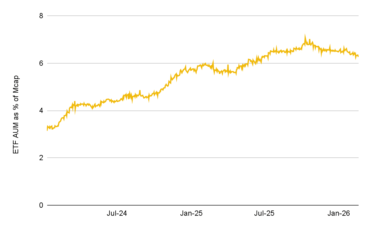 - 그럼에도 불구하고 ETF AUM은 시가총액 하락폭만큼 감소하지 않았습니다. 출시 이후 BTC 시가총액 대비 ETF AUM 비중은 상승 추세를 유지 중입니다. 이 비율은 2024년 1월 약 3.1%에서 2025년 10월 전고점 부근 약 7.0%까지 상승했으며, BTC가 약 50% 하락했음에도 불구하고 약 6.3%로 소폭 완화되는 데 그칩니다. 이는 기관의 참여가 지속되고 있음을 시사합니다.