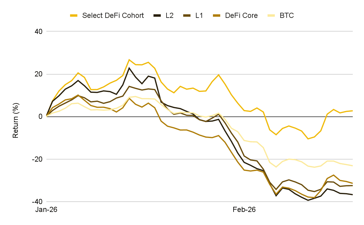 - 이러한 변화는 시장 전반의 가치 분배에 영향을 미치기 시작합니다. 의미 있는 수익 견인력을 보여주는 DeFi 프로토콜 그룹을 살펴보면, 연초 대비 L1, L2, DeFi 코어 및 BTC 벤치마크 수익률을 상회합니다. 이들 중 다수는 기관의 관심을 받고 있는 곳들로, 수익 창출과 기관의 포지셔닝이 서로를 강화하고 있으며 시장이 이러한 융합에 유리한 위치를 선점한 곳들을 중심으로 재평가되고 있음을 시사합니다.