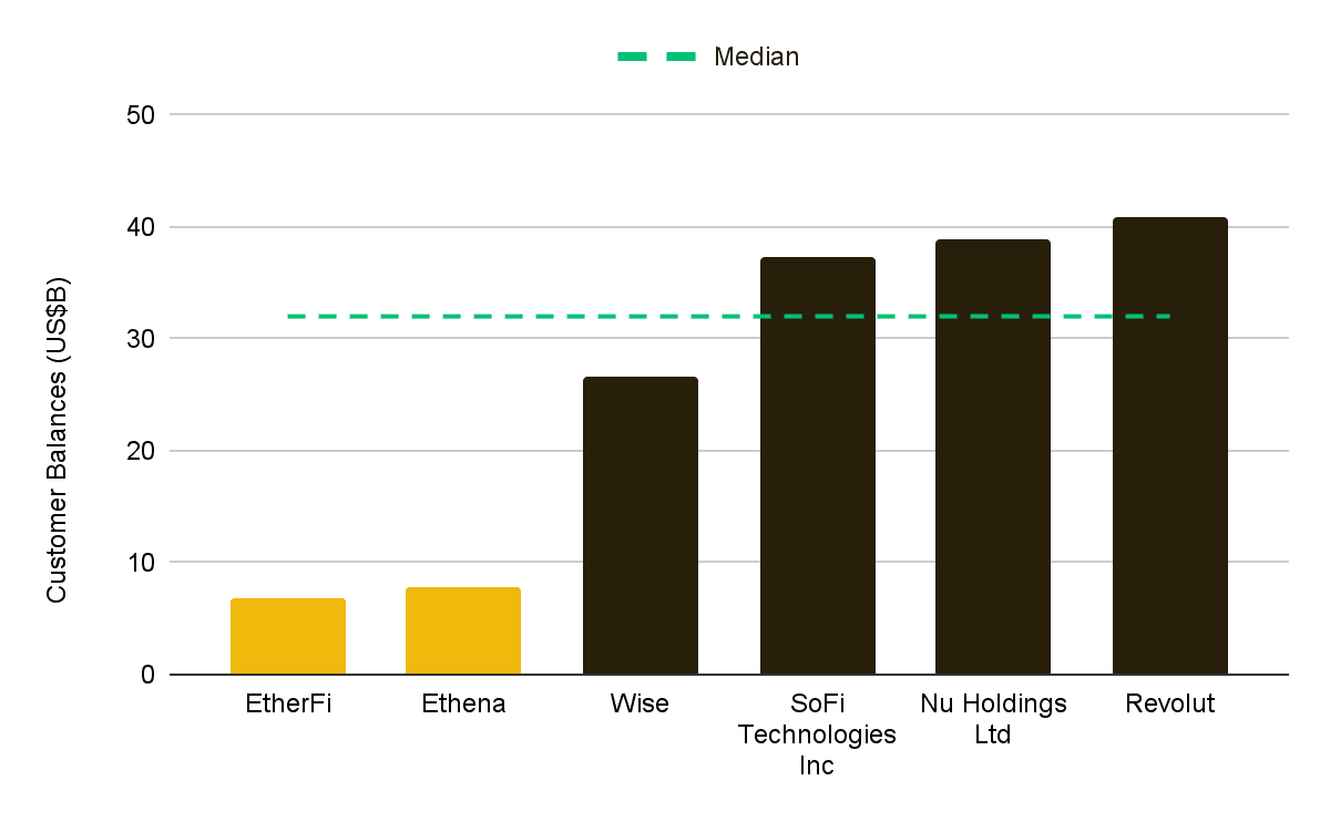 - 고성장 핀테크 플랫폼과 비교할 때, 선도적인 크립토 프로토콜들은 절대적인 잔고 기준으로는 여전히 대형 네오뱅크에 뒤쳐져 있으나, 격차는 좁혀지고 있으며 더 이상 명확한 아웃라이어가 아닙니다. 핀테크 플랫폼들은 더 오랜 기간 규모 있게 운영되어 왔으며, 네오뱅크 그룹의 고객 잔고 중앙값은 약 320억 달러로 여전히 격차가 존재함을 보여줍니다.