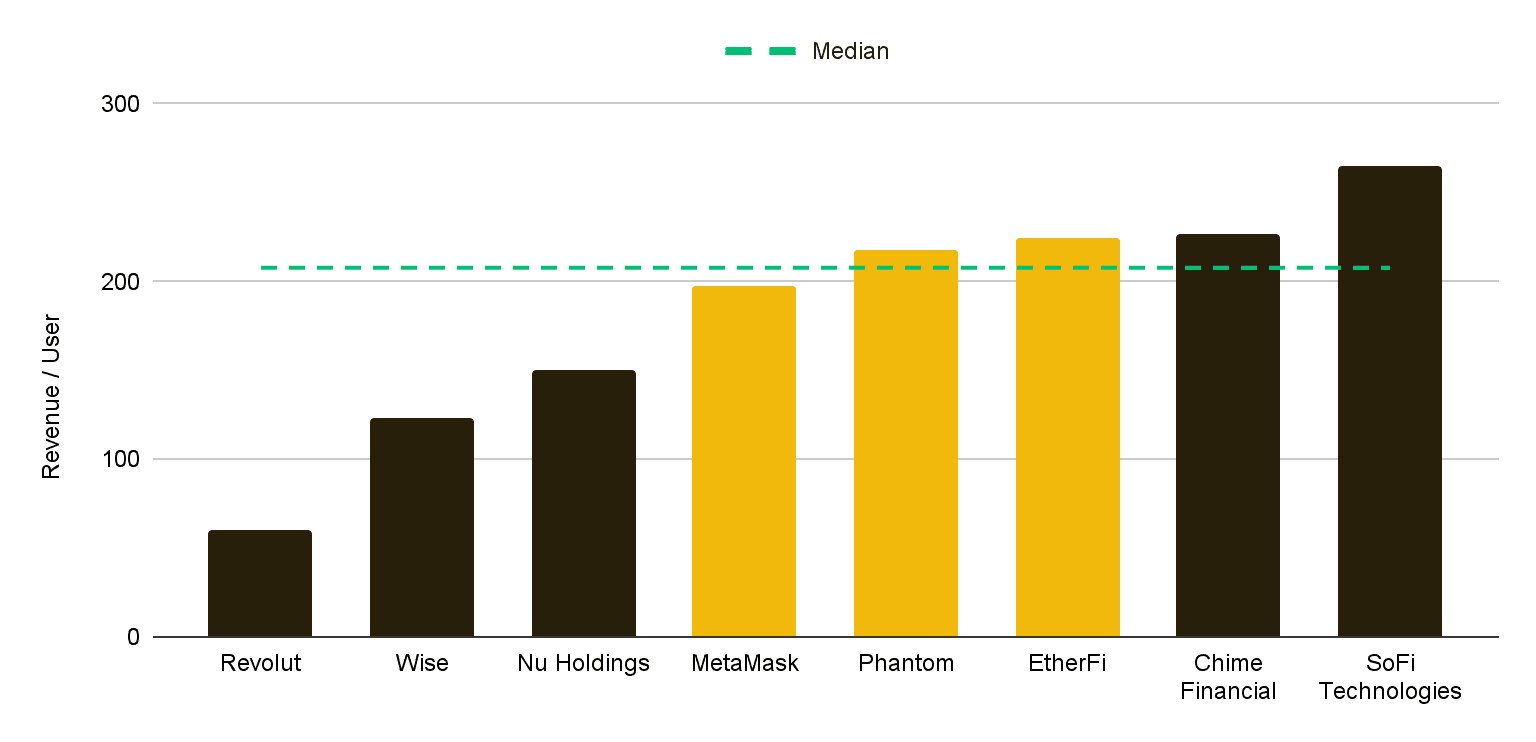 - 단위 경제 측면에서는 상황이 더 긍정적입니다. 일부 크립토 플랫폼의 사용자당 수익은 SoFi나 Chime과 비슷하며, Revolut나 Wise를 능가하는 경우도 있습니다. 이들 프로토콜은 훨씬 적은 사용자 기반으로도 기존 핀테크 플레이어와 유사한 수준의 수익화를 달성하고 있어, 규모가 확장될 경우 상당한 상승 여력이 있음을 암시합니다.