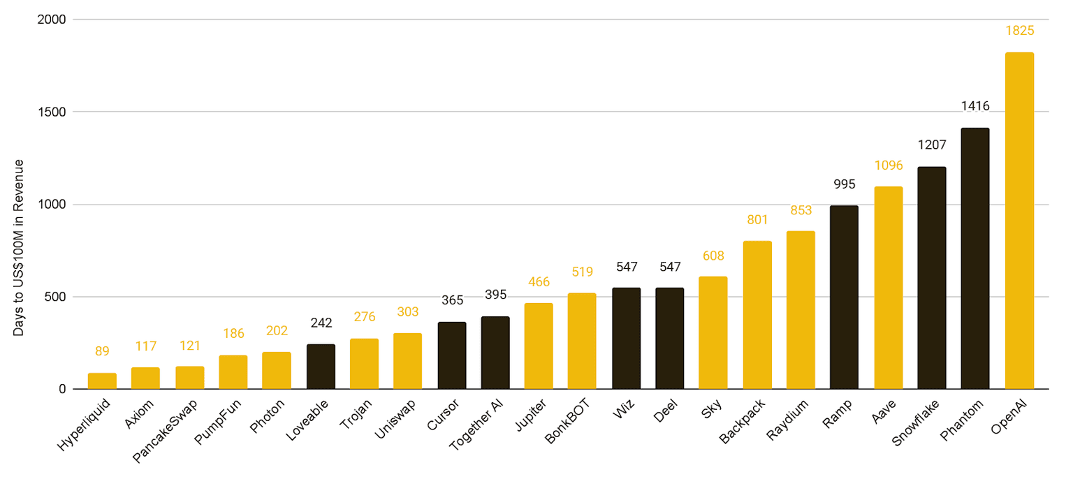 - 수익 형성 속도 또한 이러한 추세를 뒷받침합니다. 관찰된 데이터셋에서 다수의 크립토 애플리케이션이 주요 기술 기업들보다 빠르게 연간 수익 1억 달러를 달성합니다. Hyperliquid는 89일, PancakeSwap은 121일, Uniswap은 303일 만에 달성했습니다. 반면 Cursor는 365일, Snowflake는 1,207일, OpenAI는 1,825일이 소요되었습니다. 가장 빠르게 성장한 주체 중 다수가 현재 기관의 관심이 증가하고 있는 DeFi 프로토콜입니다.