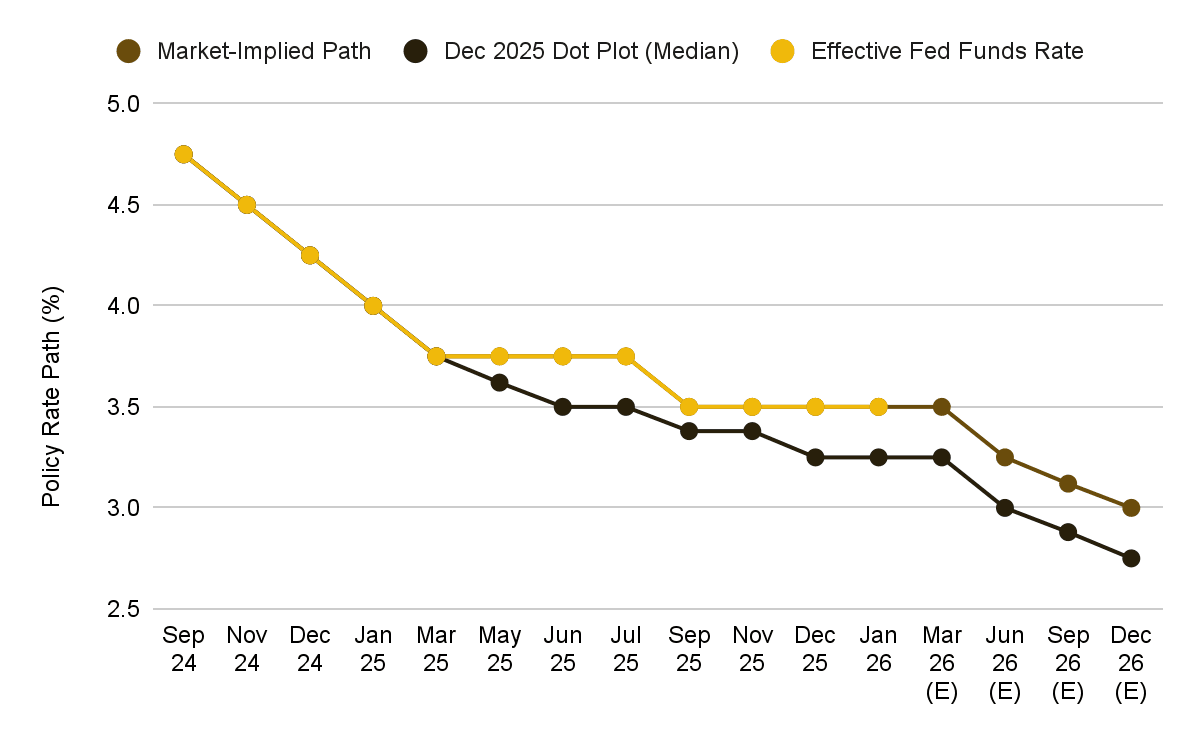 - CME 선물 시장은 현재 2026년 금리 인하폭을 약 57bp로 가격에 반영하고 있습니다. 이는 약 0.25%p씩 두 번 인하하는 수준이며, 첫 인하는 6월 이전에는 없을 것으로 예상됩니다. 그림 8은 실제 연방기금금리, 시장이 내포하는 기대 경로, 그리고 2025년 12월 점도표 중앙값 간의 괴리를 보여줍니다. 점도표는 2026년 말까지 금리가 2.75%로 떨어질 것으로 전망했으나, 현재 시장 가격과의 격차는 전망이 얼마나 크게 바뀌었는지를 보여줍니다.