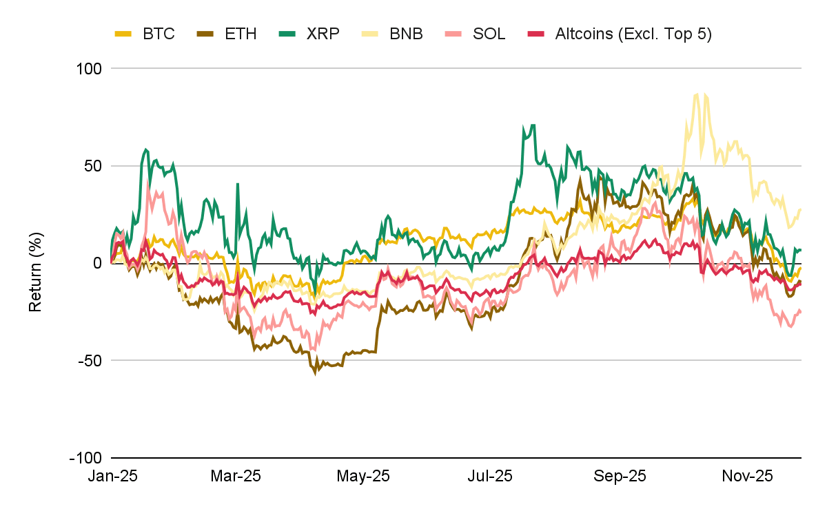 이번 사이클에서는 조정이 올 때마다 이러한 양극화가 심화되었습니다. 메이저 코인들은 풍부한 유동성과 지속적인 유입의 혜택을 받는 반면, 대부분의 알트코인은 구조적인 매수세가 부족하여 하락장이 올 때마다 전 고점에서 더 멀어지고 있습니다.