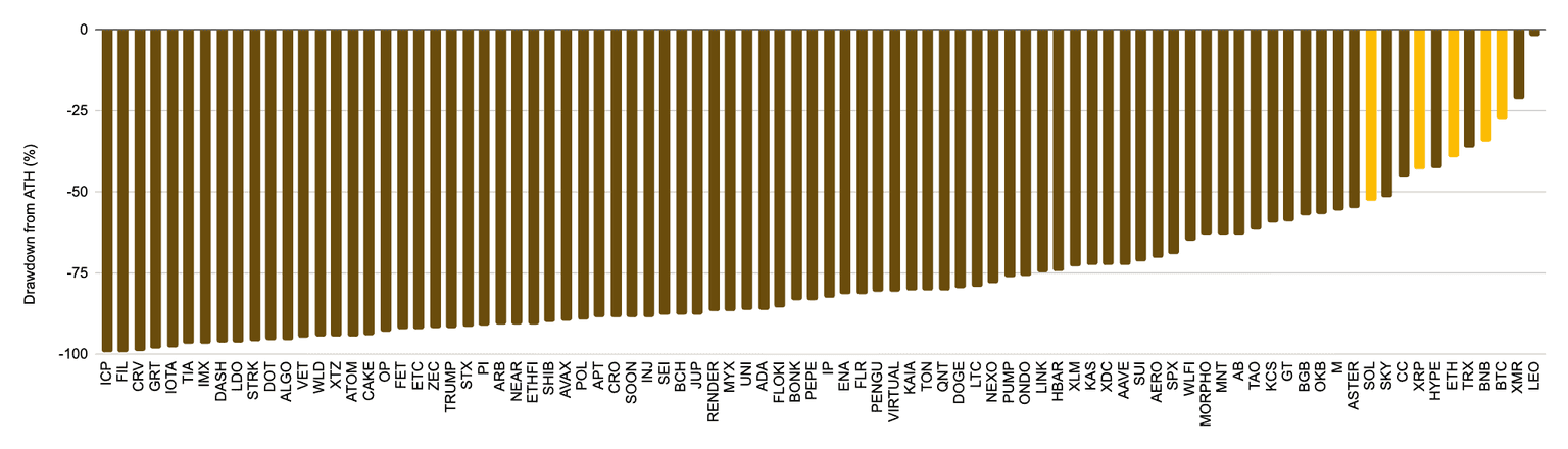 이번 주 완만한 회복세에도 불구하고, 이번 사이클에서 가상자산 시장 전반이 어떤 위치에 있는지 짚어볼 필요가 있습니다. 상위 100개 토큰 중 79개가 여전히 사상 최고가 대비 50% 이상 하락해 있다는 사실은 이번 랠리의 수혜 범위가 얼마나 좁았는지를 보여줍니다. 일부 메이저 코인들이 연중 신고가를 경신하거나 근접했음에도 불구하고, 대다수의 알트코인은 상승장에 의미 있게 동참하지 못했습니다.