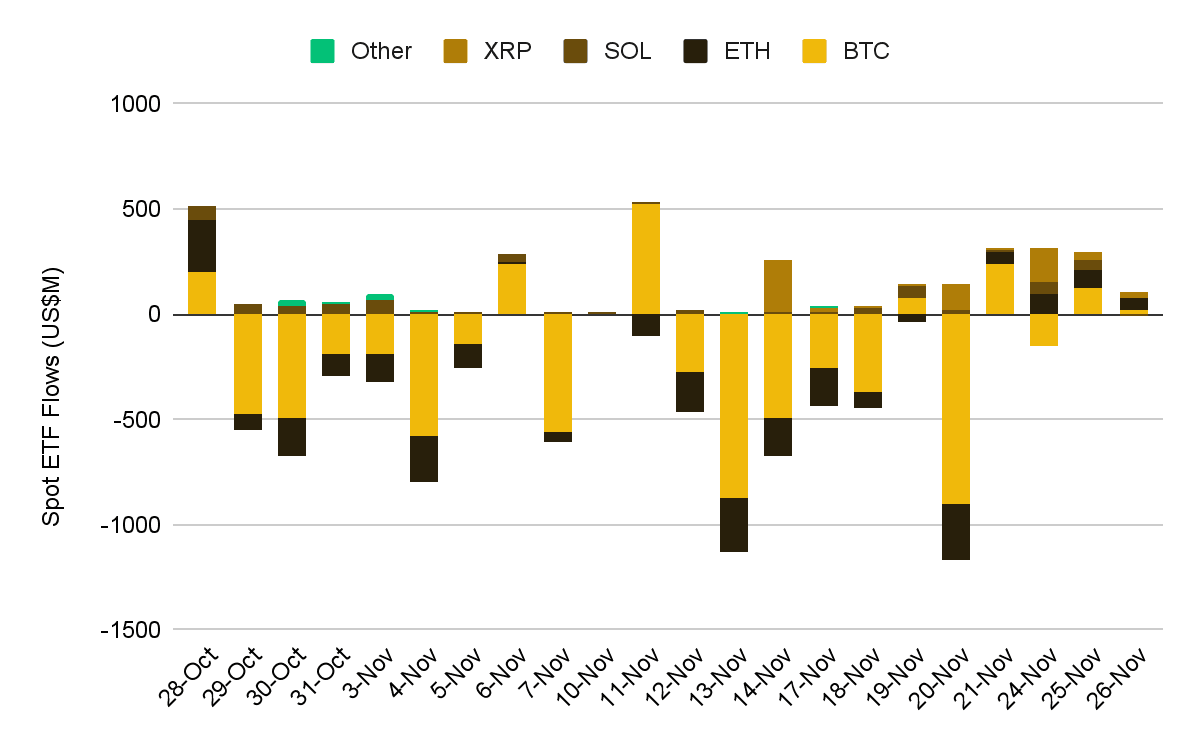 최근 몇 주간 활발했던 한 가지 테마는 알트코인 ETF 승인입니다. 이들 중 다수는 출시 이후 지속적인 순유입을 보이고 있습니다. 아직 초기 단계지만, 추가적인 알트코인 ETF들이 승인을 기다리고 있어, 전통 금융 시장으로의 확장을 통해 알트코인 거래 지형을 재편할 것으로 보입니다.