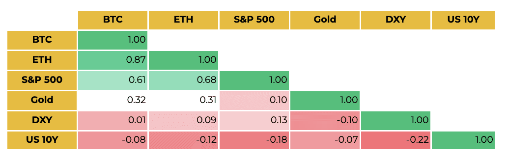 BTC와 디지털 자산은 전반적으로 위험 자산과 동조화되어 거래되고 있지만, BTC와 주식 간의 2개월 상관계수는 소폭 하락했습니다. 동시에 금과의 상관계수는 0.32로 상승했는데, 이는 최근의 리스크 오프 국면이 진정되면서 시장의 행동 양식이 변화할 가능성을 시사합니다.