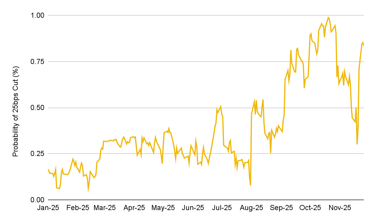 이번 주 시장은 올해 마지막 FOMC 회의에서의 금리 인하 기대감이 높아짐에 따라 더욱 명확해진 거시경제 신호에 힘입어 반등했습니다. 금리 인하 확률은 지난주 30% 수준에서 약 85%까지 치솟았으며, 이러한 변화는 달러 인덱스(DXY) 약세와 미국 국채 금리 하락으로 이어졌습니다.
