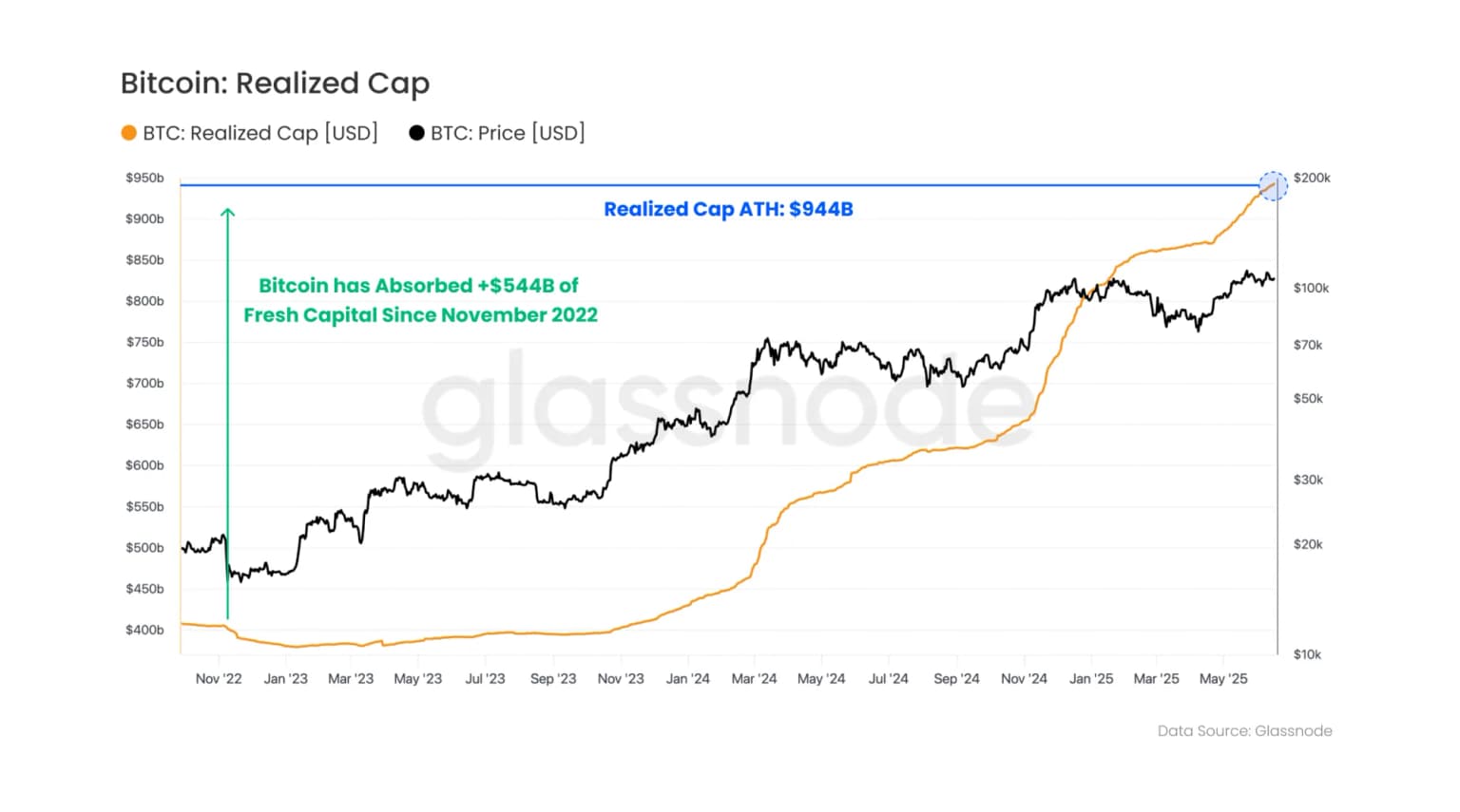 Realized Cap has surged by over 944B. As institutional and sovereign adoption accelerate, on-chain data shows that Bitcoin’s role in the global financial system is expanding - mirroring broader macro liquidity trends.
