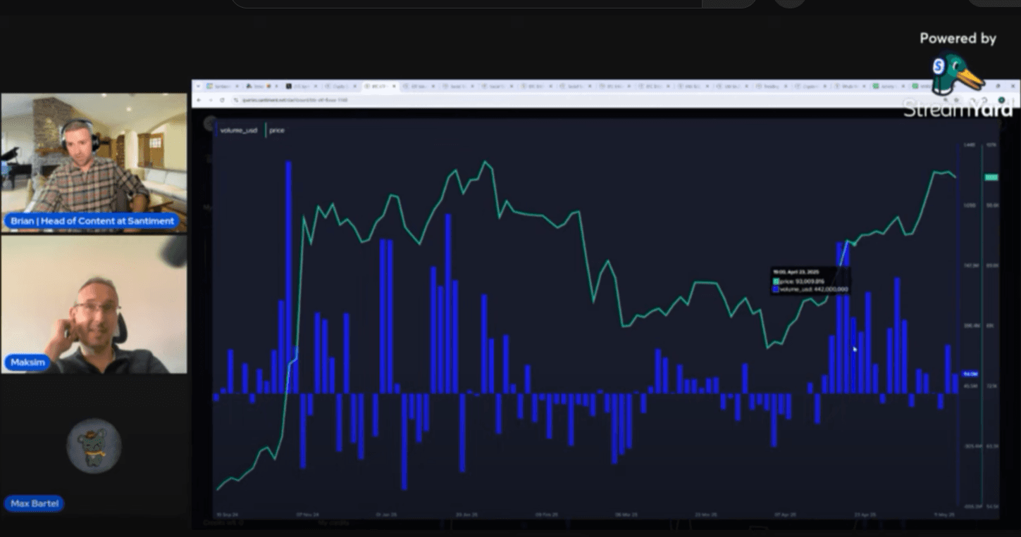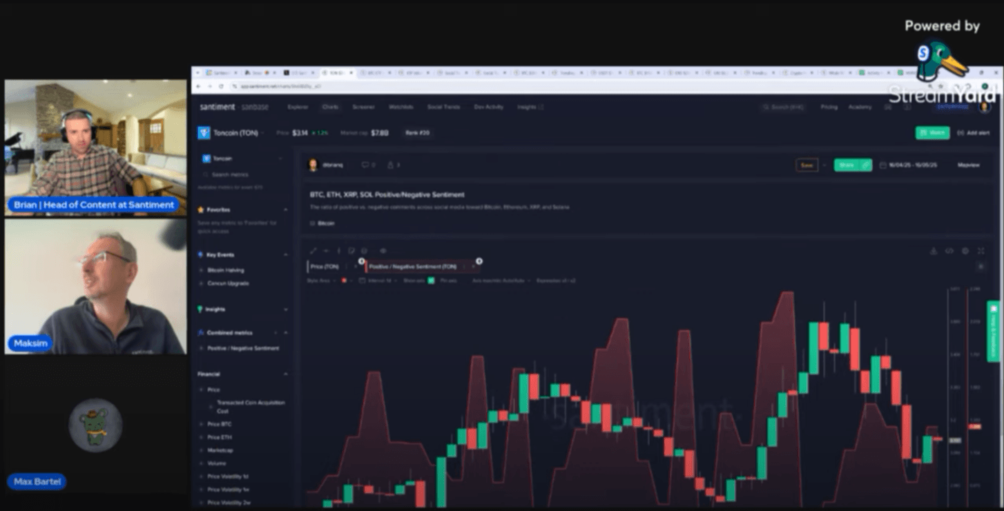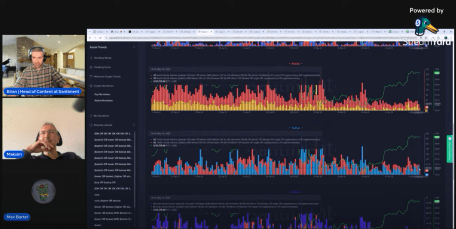 The show officially kicked off with Maksim expressing a desire for market stability. He voiced a common sentiment among long-term crypto participants: suspicion when things seem "too lucky" for too long, noting, "When you're a long time in crypto you feel suspicious why why are we so lucky." He suggested looking at data like net realized profit/loss and MVRV to gauge if these concerns are widespread and if the market can push higher, also mentioning that strong, convincing moves can sometimes happen at the end of a trend to induce FOMO.