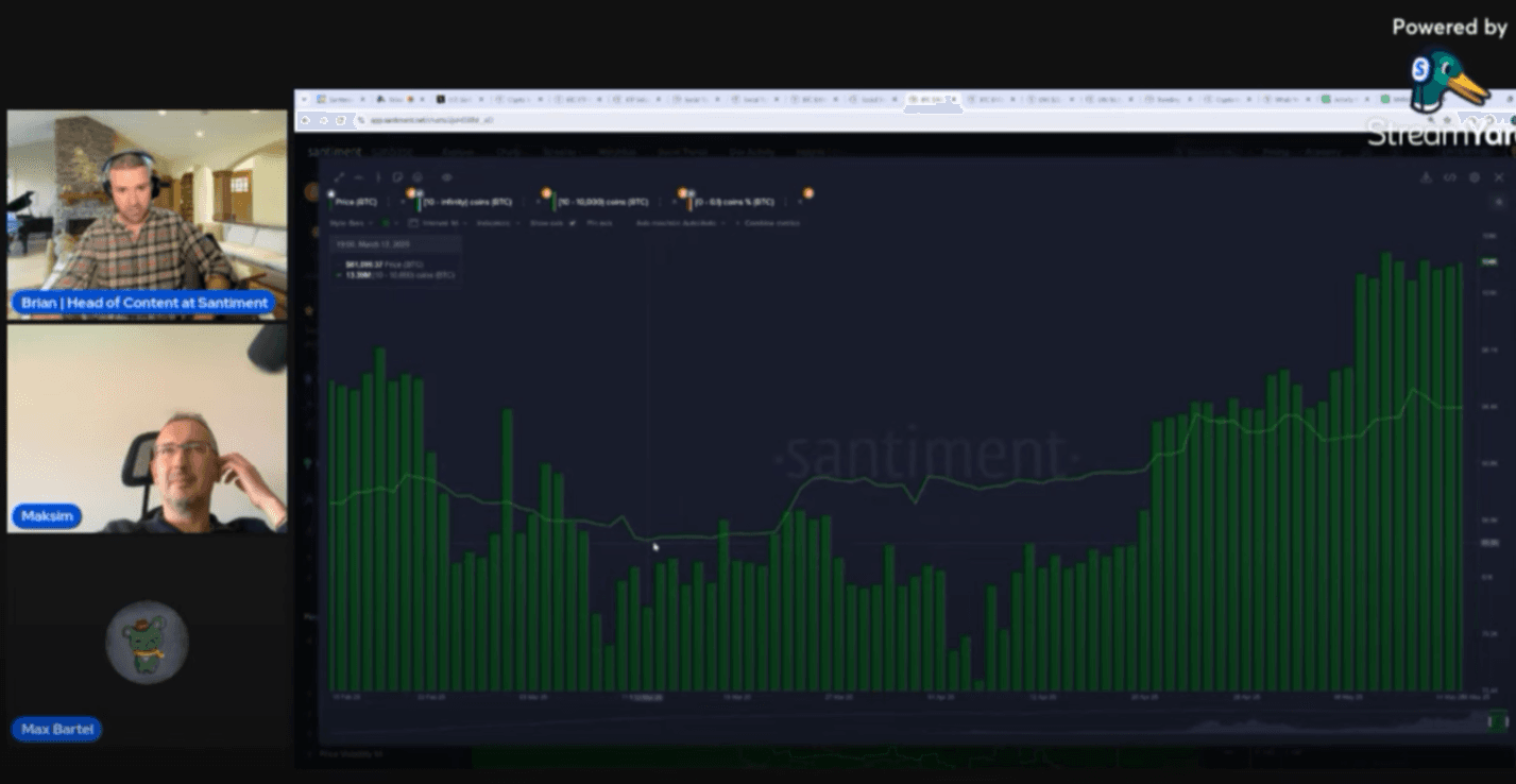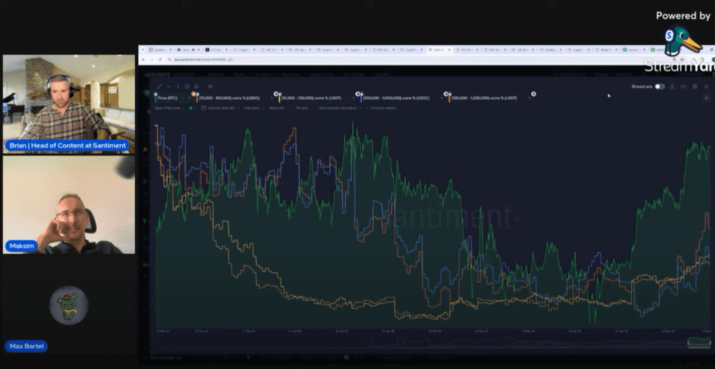 The conversation shifted to whale activity. Brian noted that small holders (represented by a red line on their chart) are decreasing their holdings, likely taking profits. Conversely, larger holders (entities holding 10 to 10,000 BTC, shown by a green line) have been accumulating significantly since early April, adding about 55,500 BTC. "If you're bullish this is probably one of your best arguments," Brian said, as this trend of accumulation by large Bitcoin holders has historically correlated well with price increases, making whale watching a valuable activity.