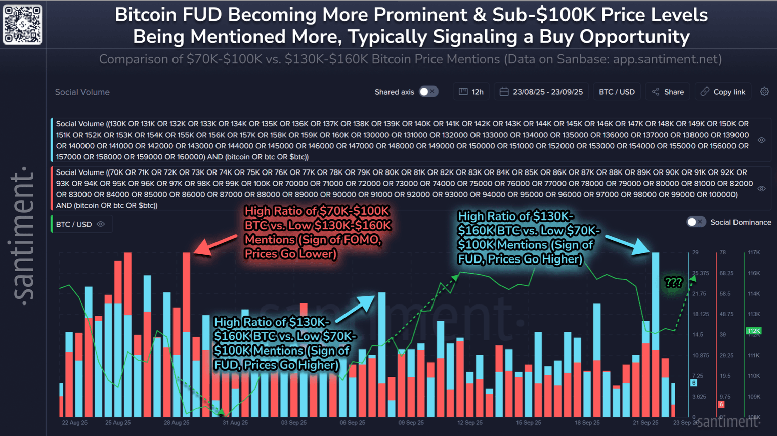 π As usual, social media is vocal on where Bitcoin will head next. Historically, lower price predictions increase the likelihood, and higher predictions imply lower future prices.