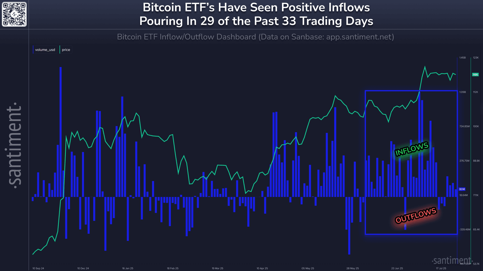 π Bitcoin's ETF inflows have been great confirmation signals of cryptocurrency markets' continued rises. Over the past 33 trading days, 29 of them (%) have see