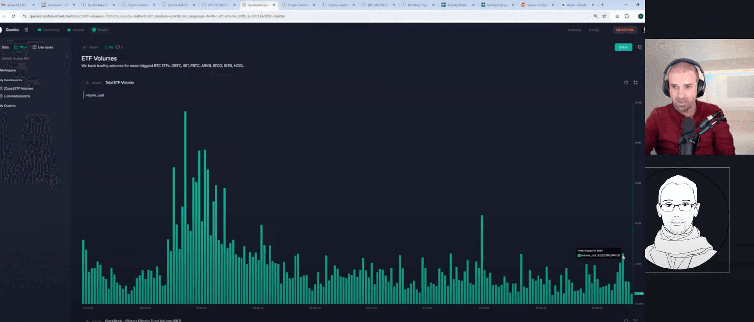 ETF volumes have reached a two-and-a-half-month high, with over $3 billion in volume on October 14th. This surge in volume is likely due to significant inflows into ETFs, which could have a positive impact on Bitcoin's price. The discussion highlighted the importance of monitoring ETF inflows and outflows as a key metric for understanding market trends.