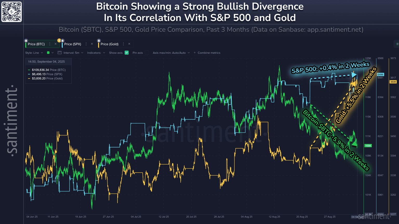 π There is a major bullish divergence that has been forming over the past two weeks: π Bitcoin's market value has DROPPED -5.9% since Aug. 22nd β‘οΈ S&P 500 has