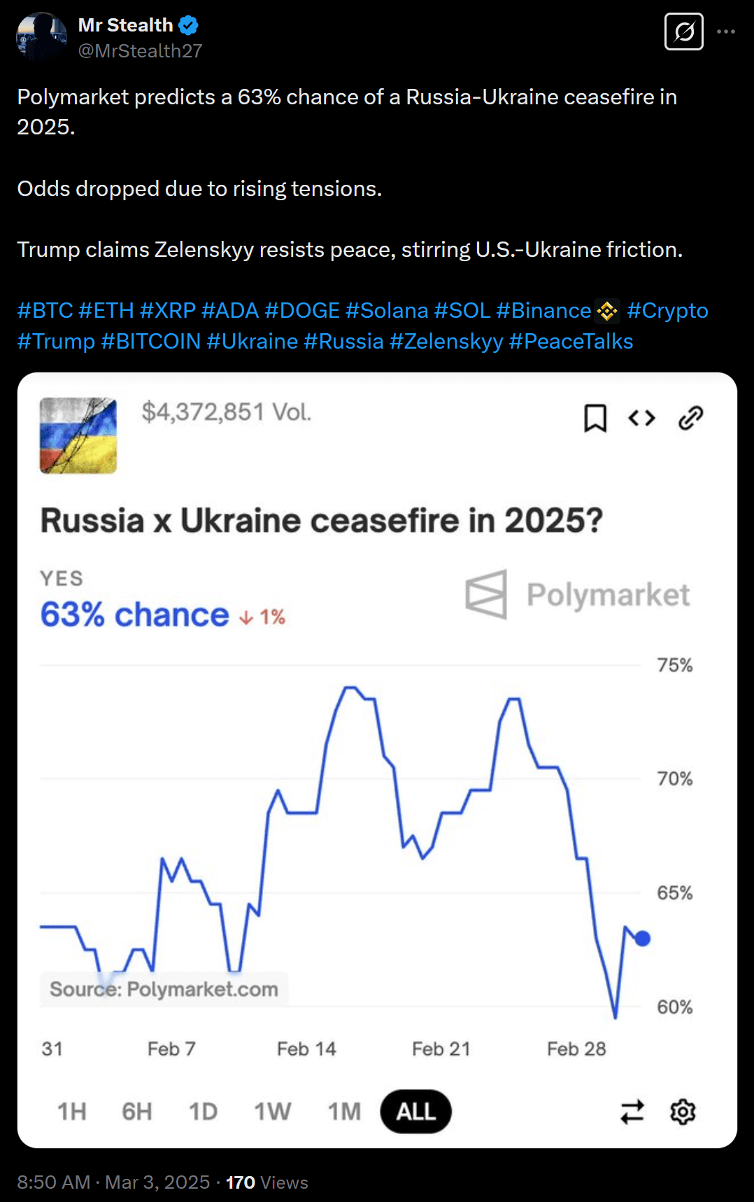 Diplomatic unpredictability rattled markets, causing fluctuations in both traditional and crypto assets. Investors watched geopolitical developments closely. On Polymarket, as we can see below, voting participants reflected that the odds of a Russia-Ukraine ceasefire by year-end spiked to 63% following the Trump-Zelenskyy meeting.