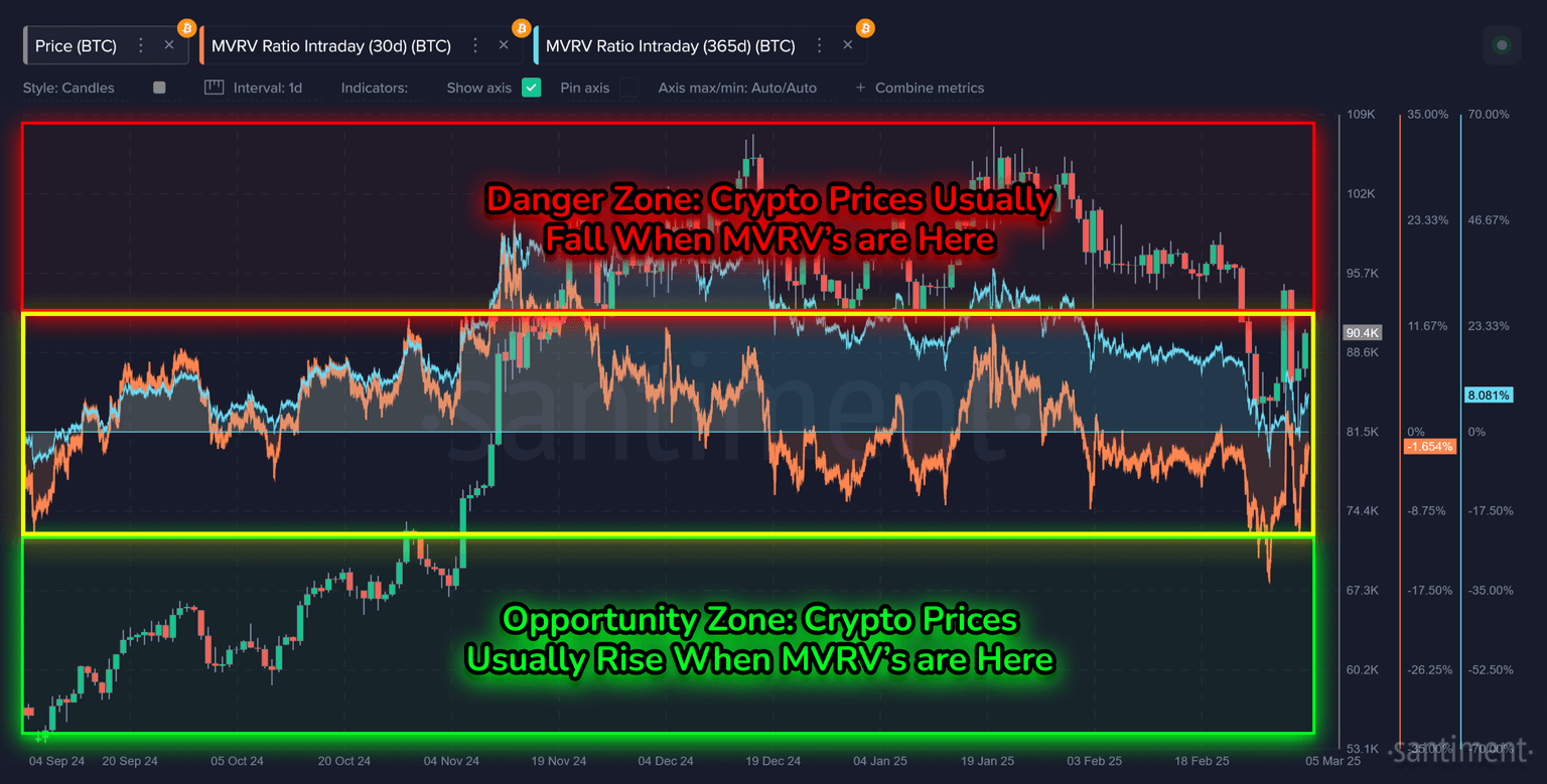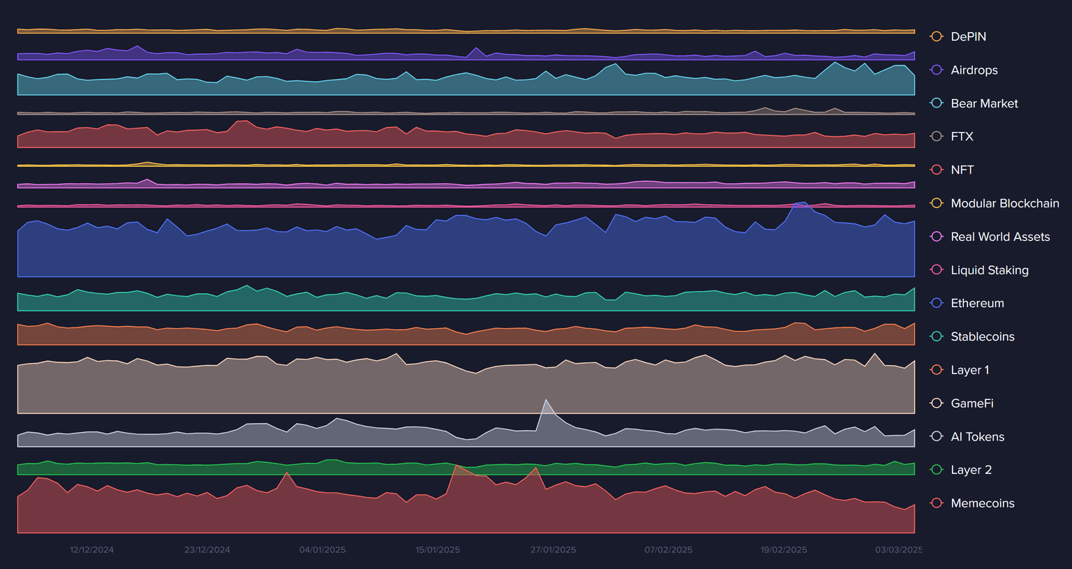 The amount of non-empty wallets on Bitcoin’s network has now grown by approximately 50K from Feb 5–Mar 5, 2025. This is a sign that crypto traders aren’t shaken by the huge current volatility across crypto. It also indicates that many traders are choosing to liquidate their more speculative investments (such as meme coins), and moving their capital to Bitcoin for safe(r) keeping.