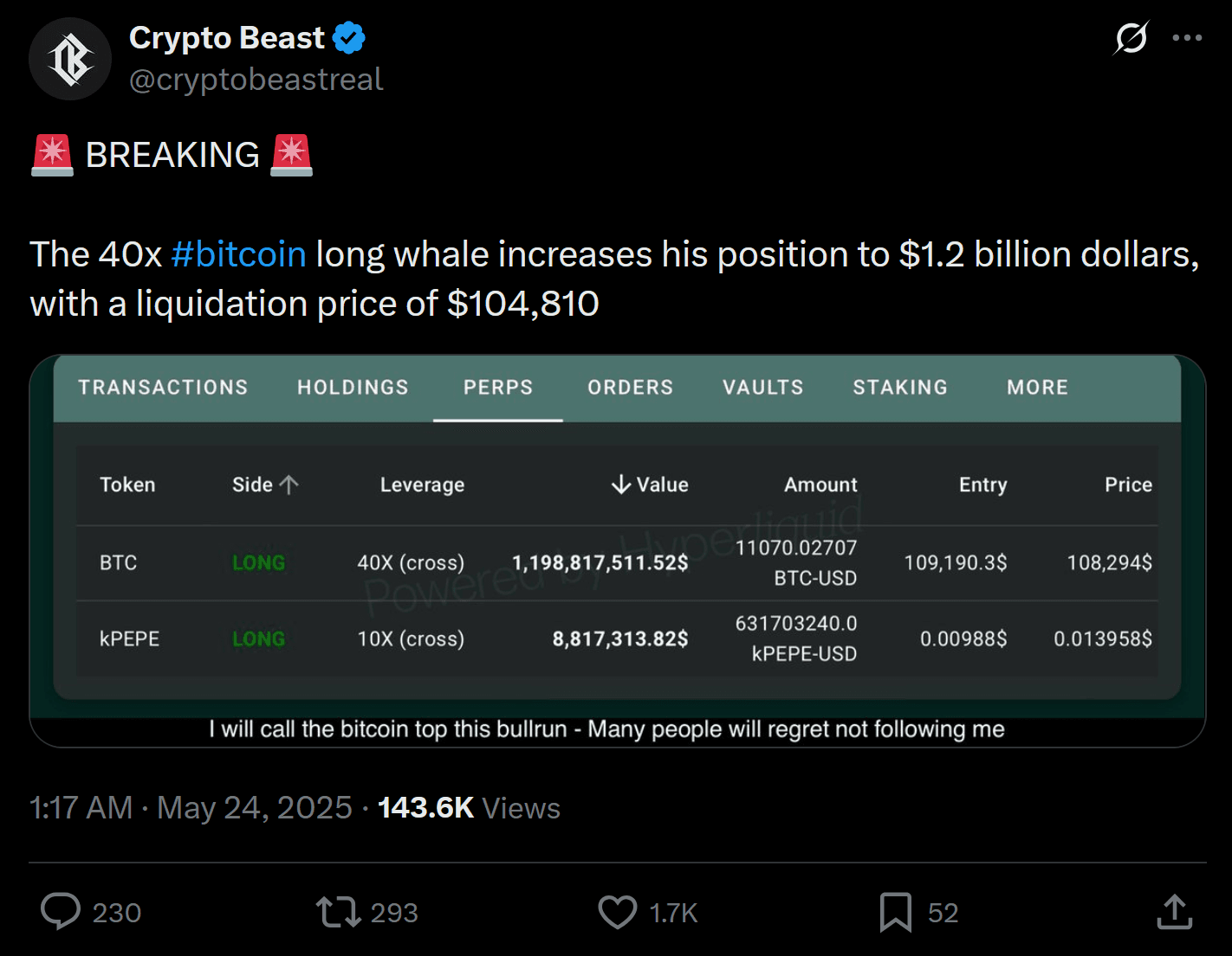 Meanwhile, a discovery from @cryptobeastreal went viral on X after it was pointed out that a whale with a 40x leveraged position increased the value of their perpetual contract to $1.2B.