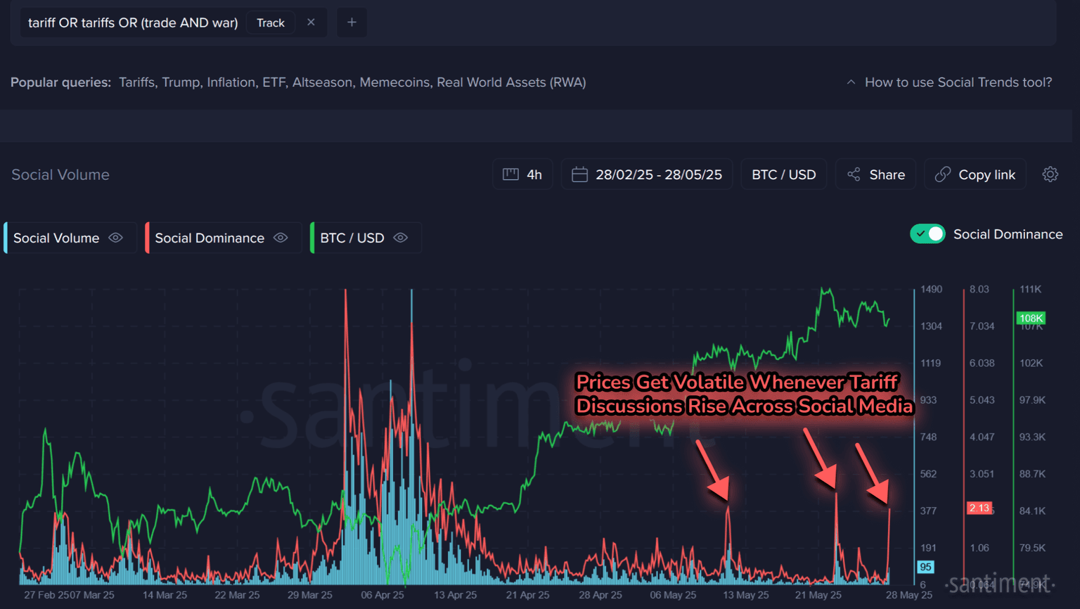 Santiment data shows that whenever tariff discussions spike on social media, crypto prices often react sharply. One of the largest jumps in mentions of trade conflict occurred in the final days of May, echoing a similar burst of activity seen during the steep correction in early April. Although the damage was lighter this time, the market’s mood clearly shifted as investors braced for further volatility.