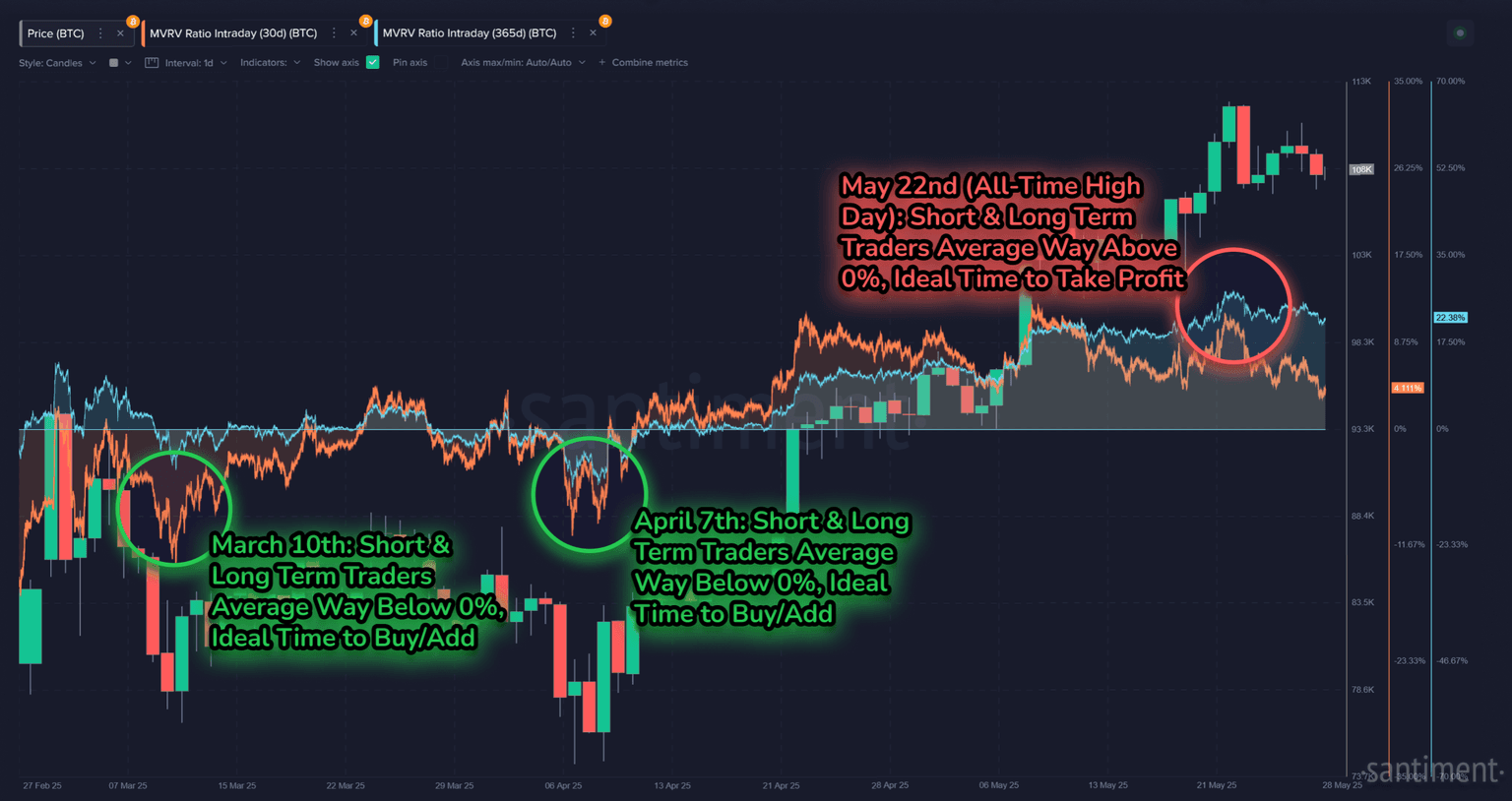 That said, on May 22, 2025, both 30-day and 365-day MVRV ratios were well above 0%, meaning that both short- and long-term holders were, on average, deep in profit — an ideal time for many to take gains. By contrast, on March 10 and April 7, both MVRV metrics dipped far below 0%, indicating that most holders were in the red — historically a strong buy signal.