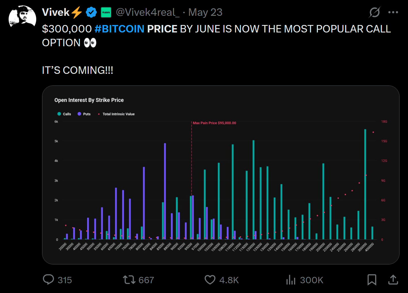 It was also reported by Vivek on X that the most popular call option is $300K Bitcoin by June 2025. Though this sounds lofty, it does reflect the crowd’s still-bullish optimism for the long term.