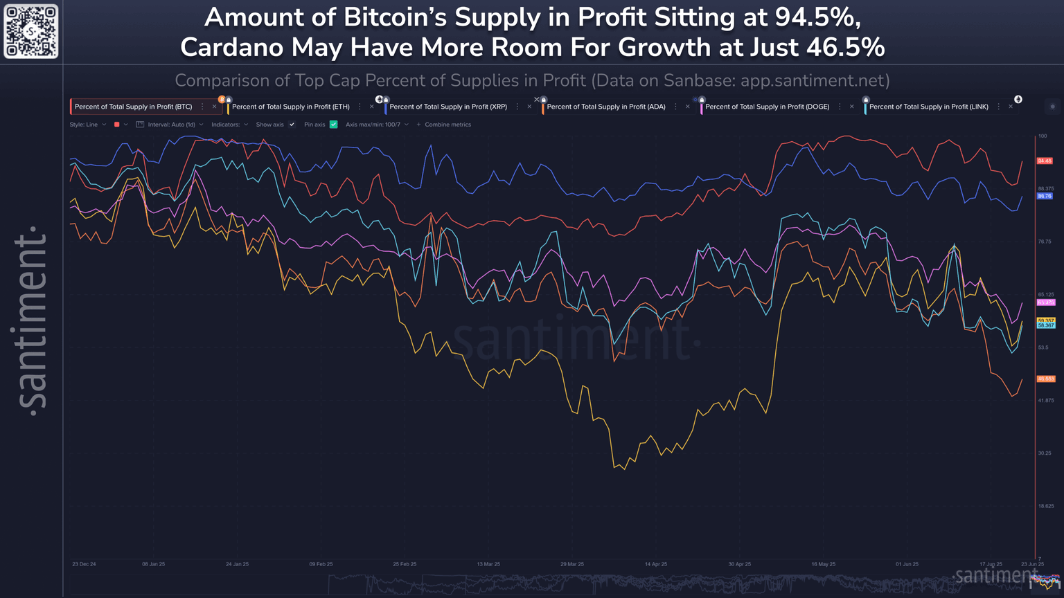 π Here is the Percent of Total Supply in Profit for six top-cap cryptocurrencies. This metric tracks the percentage of each assetβs circulating supply currentl