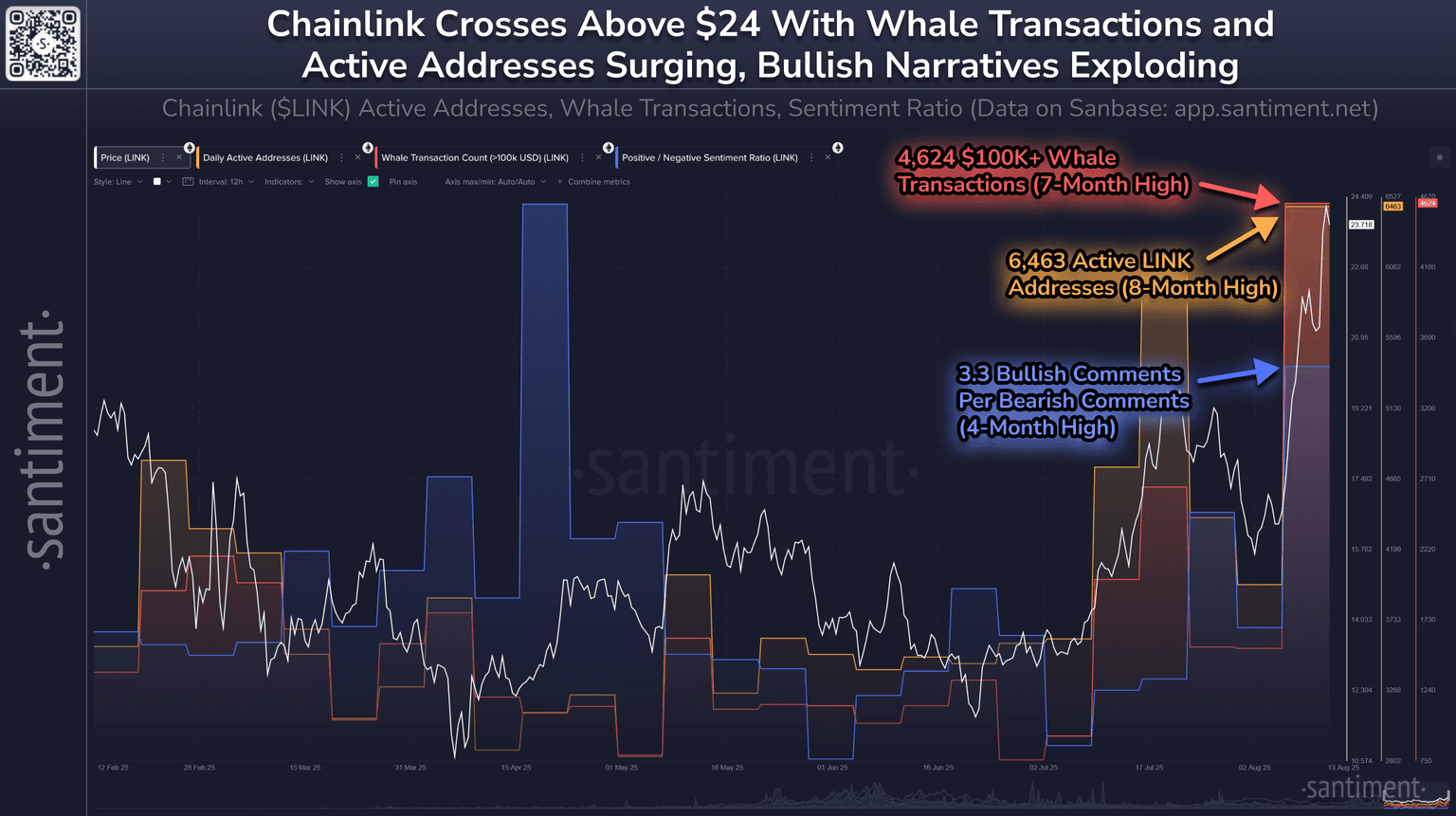 π Chainlink marines are regarding crypto's #11 market cap with the highest level of bullishness since February 1st. On the on-chain side, we're seeing the most active $LINK addresses in 8 months, and most whale transactions in 7 months.