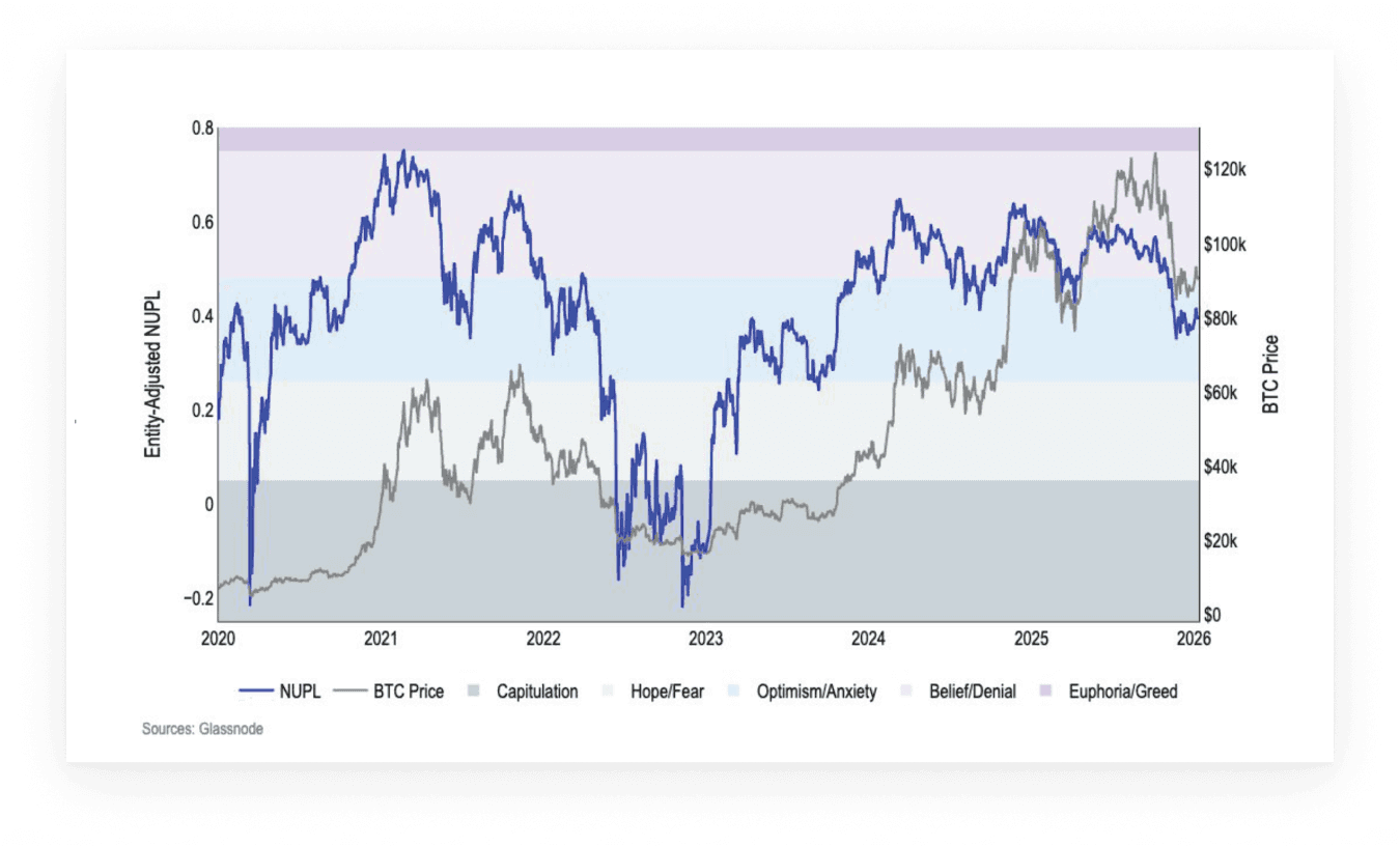 Market sentiment for Bitcoin has remained restrained entering Q1 2026. Net Unrealized Profit/Loss shifted from Belief to Anxiety during Octoberβs liquidation event and has since stabilized at lower levels. This reflects lingering caution among participants, even as macro conditions and price structure have stabilised.
