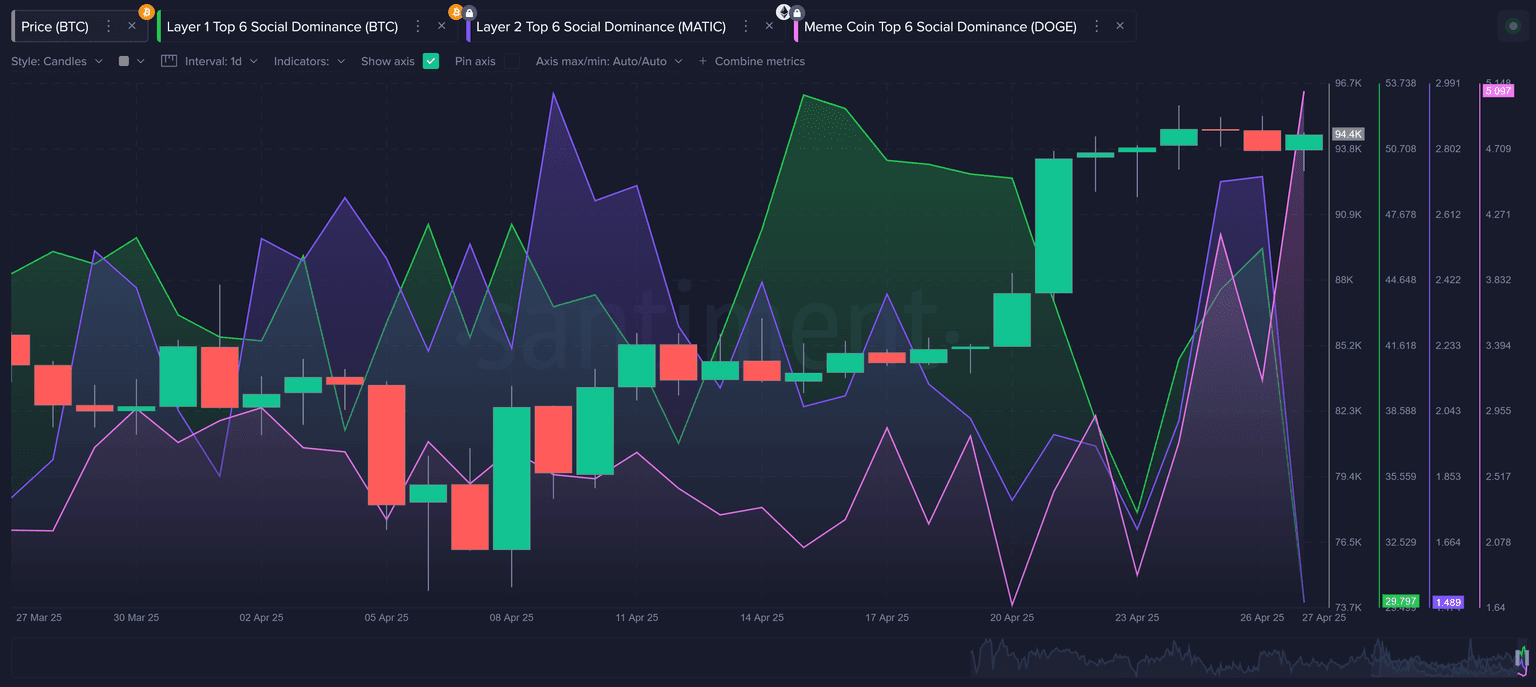 Looking at the trends of what traders are talking about, there has been a sky-high spike in meme coin discussions as well. As usual, when prices begin to soar, traders' interests can't help but veer toward the juicier, higher risk/reward, speculative assets. As the cycle goes, the retail crowd will experience enough losses during a bear cycle (which happened from mid-January to early April) to trade away their altcoins for Bitcoin or stablecoins. But when we see a resurgence in market caps as we have during the second half of April, traders can't resist getting back into a "gamble" mentality.